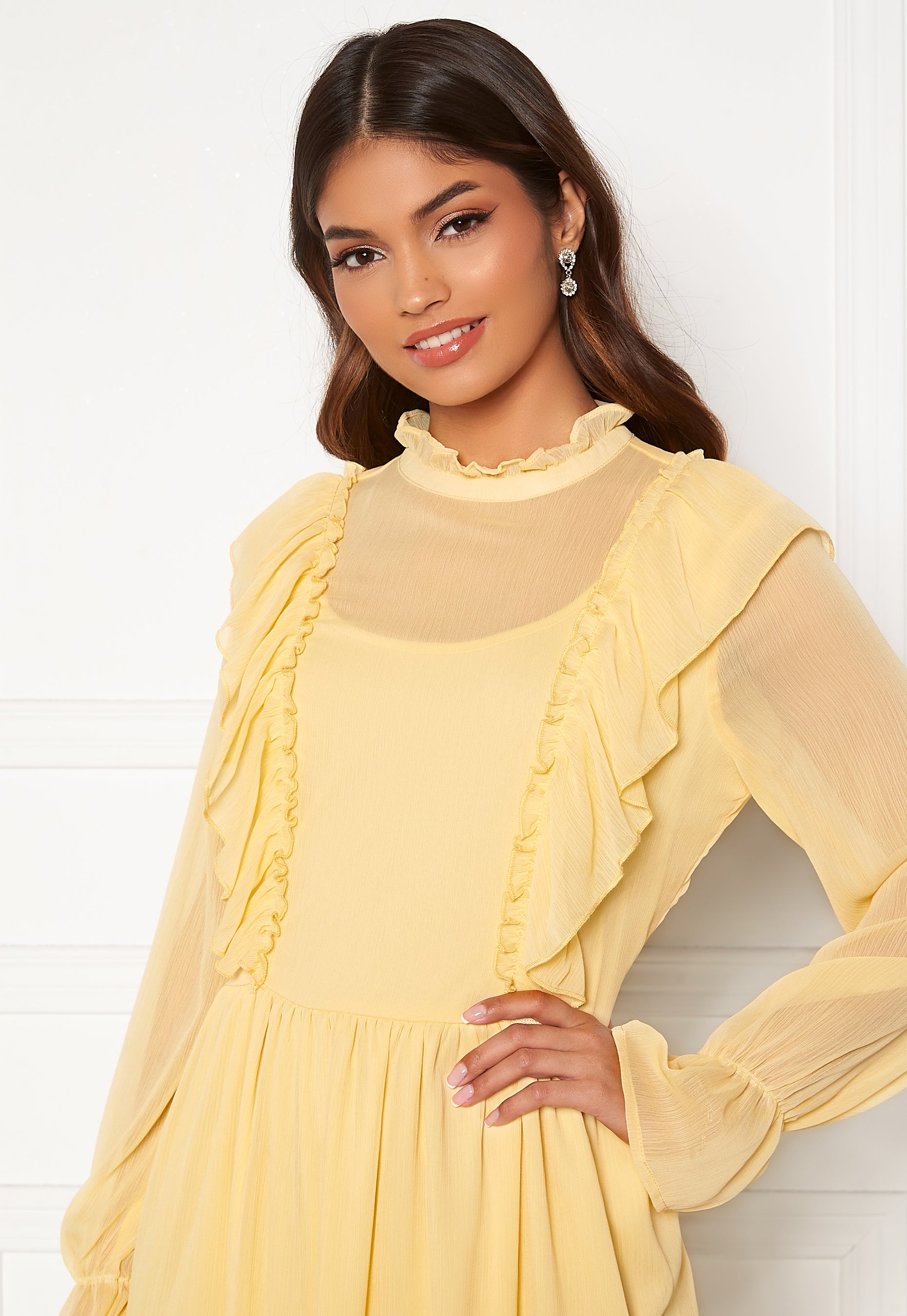 Feminine dress with pretty details. - Nonstretch, woven quality - Elastic at the sleeve cuffs - Flounce details _ High neckline - Transparent - Lined - Back length from shoulder: 112 cm in size 36. The model is 168 cm tall and wears a size 38. Machine wash at 30 degrees.
