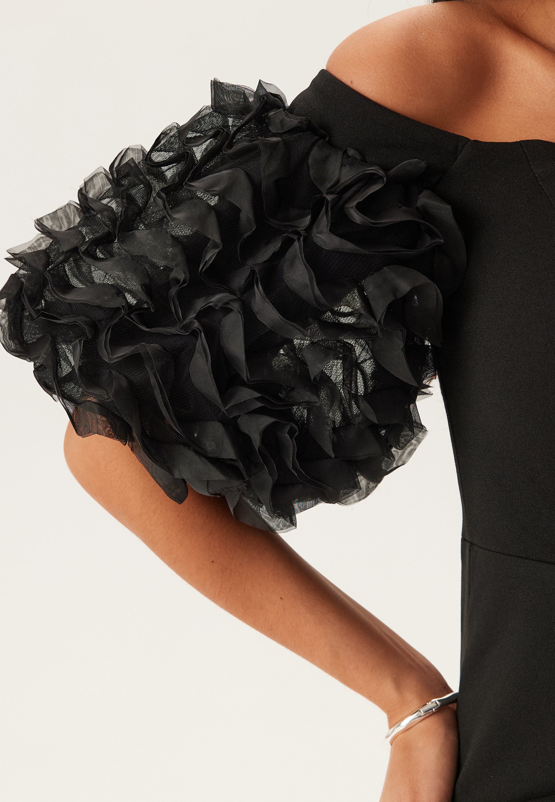 What sets it apart is the contrast between the sleek stretch fabric and the dramatic pleated short sleeves with frill detail. The bardot neckline shows off the shoulders beautifully, and the hidden back zip keeps the look smooth and streamlined from every angle.