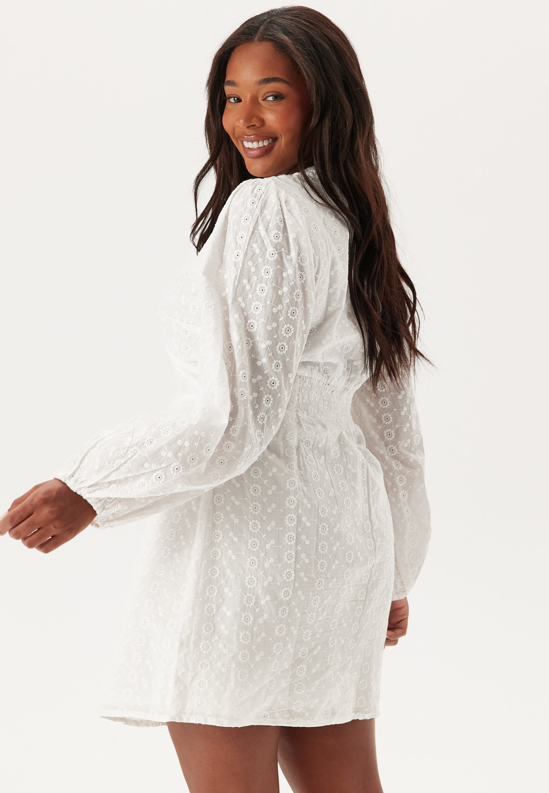 This white broderie anglaise mini dress with long balloon sleeves is an easy pick for graduation, summer parties, and dressed-up daytime plans. The woven fabric and soft lining give it a light, comfortable feel, while the V-neckline and defined waist create a flattering shape that feels polished without trying too hard.