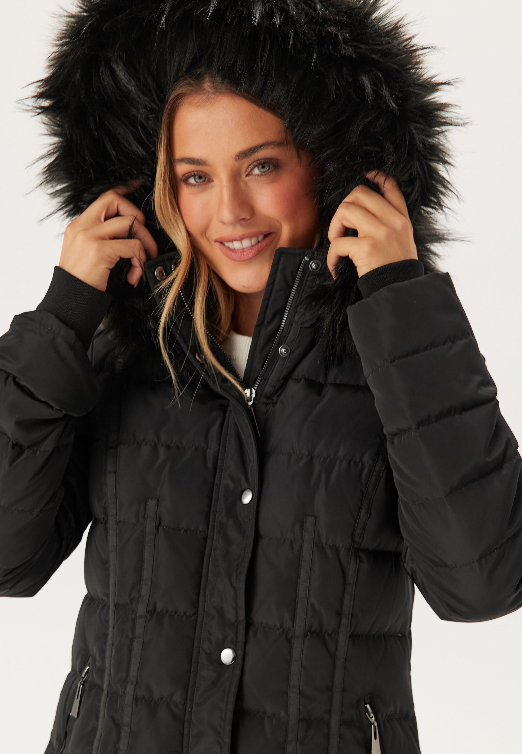 - Removable faux fur trim on the hood