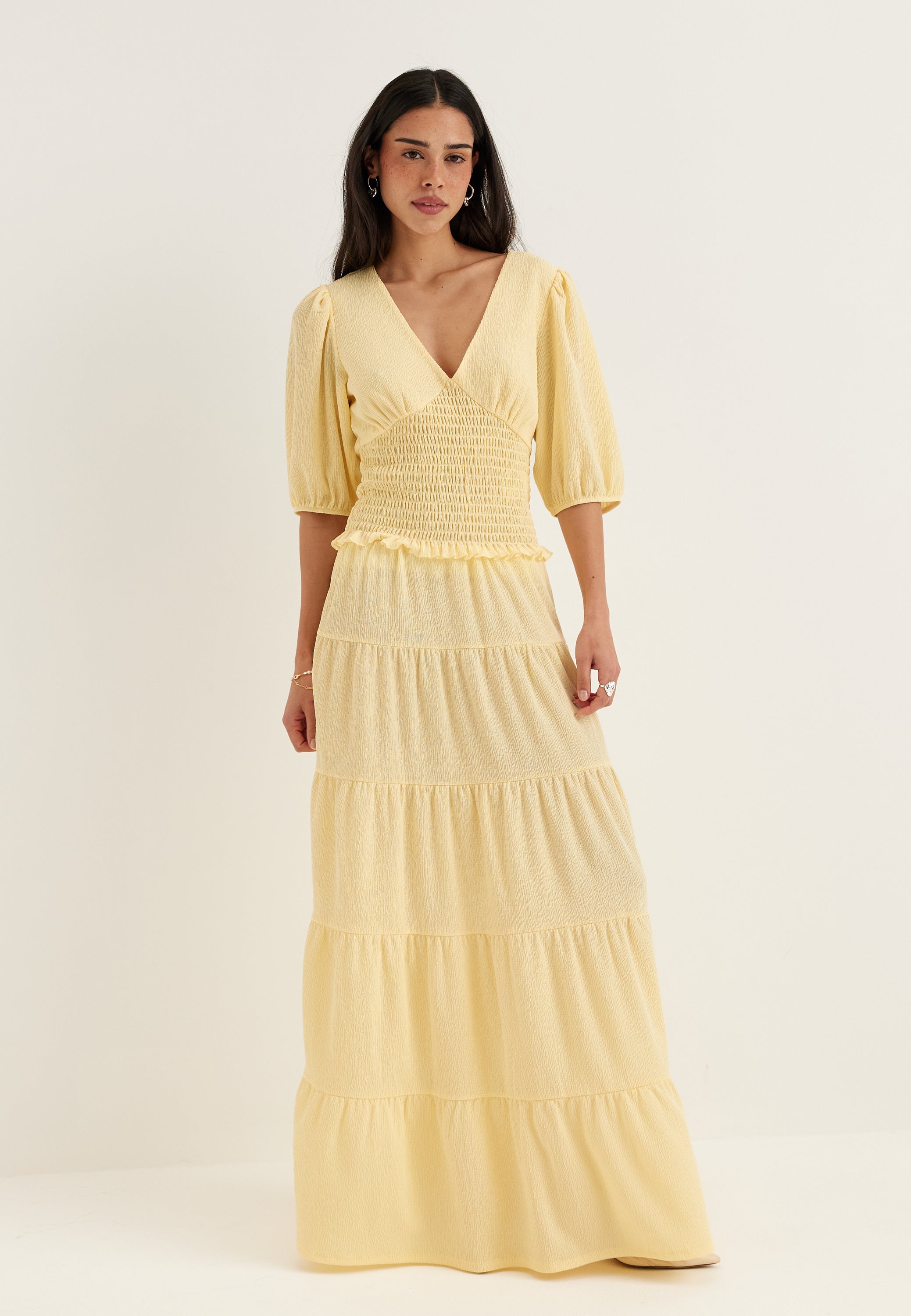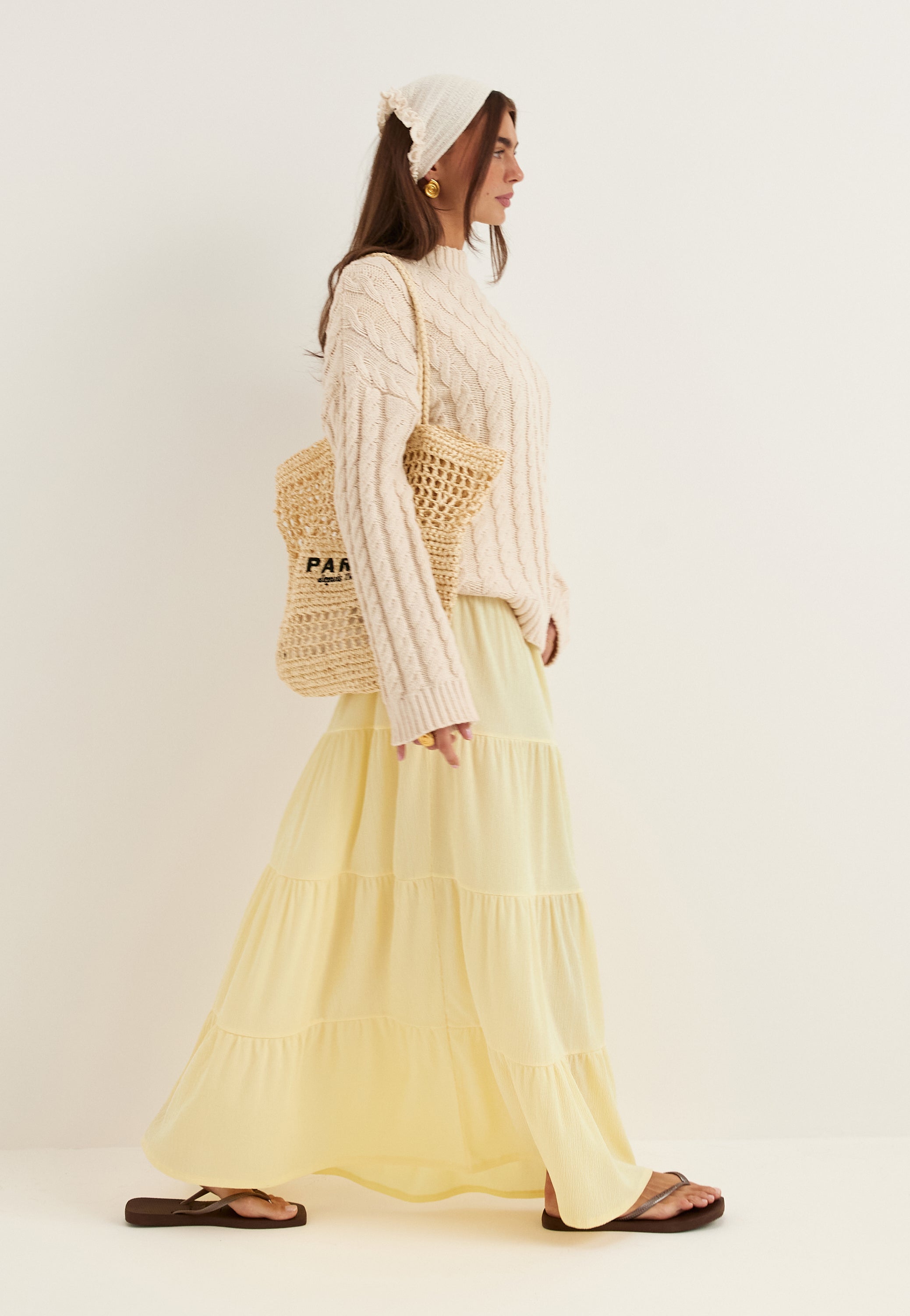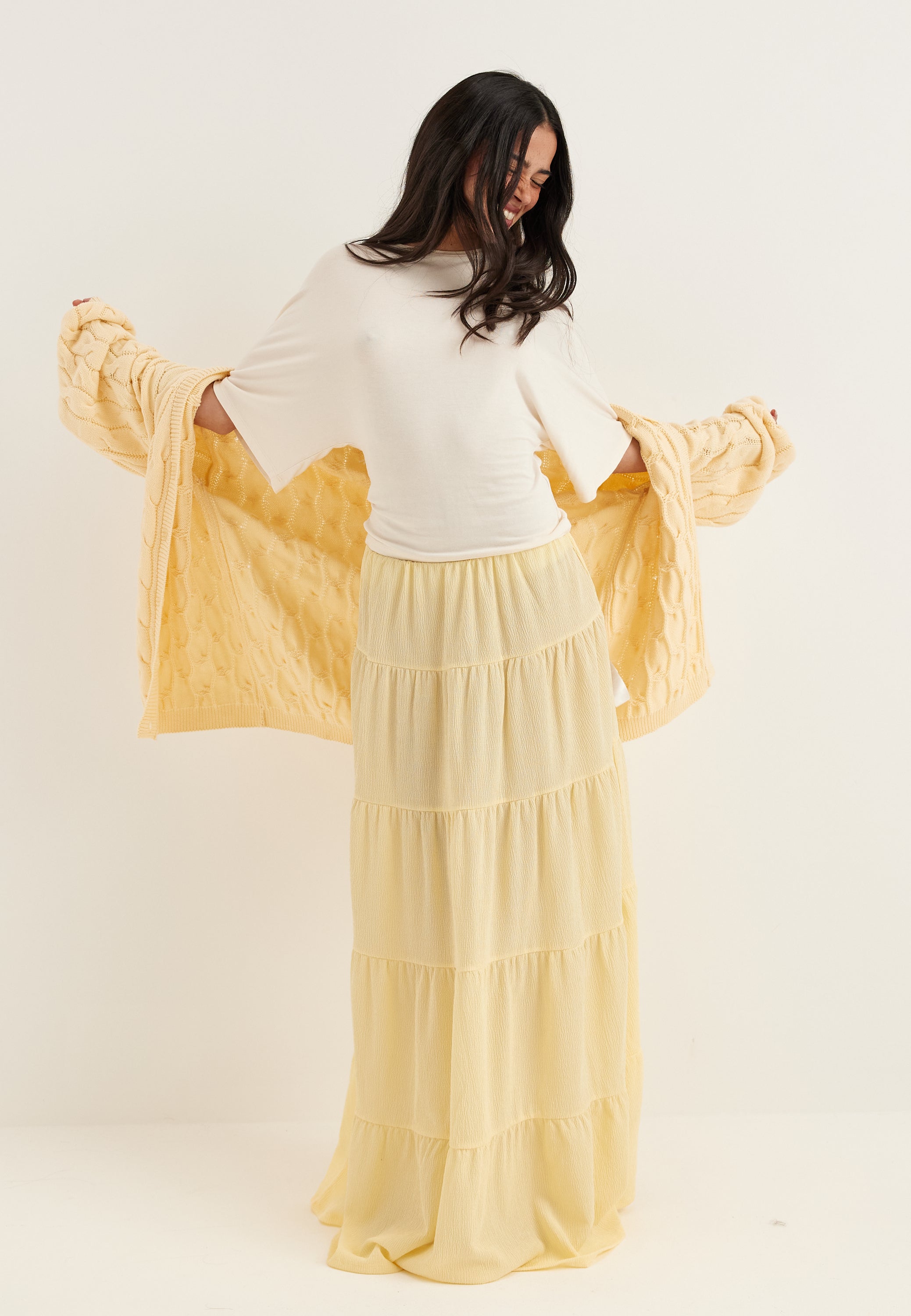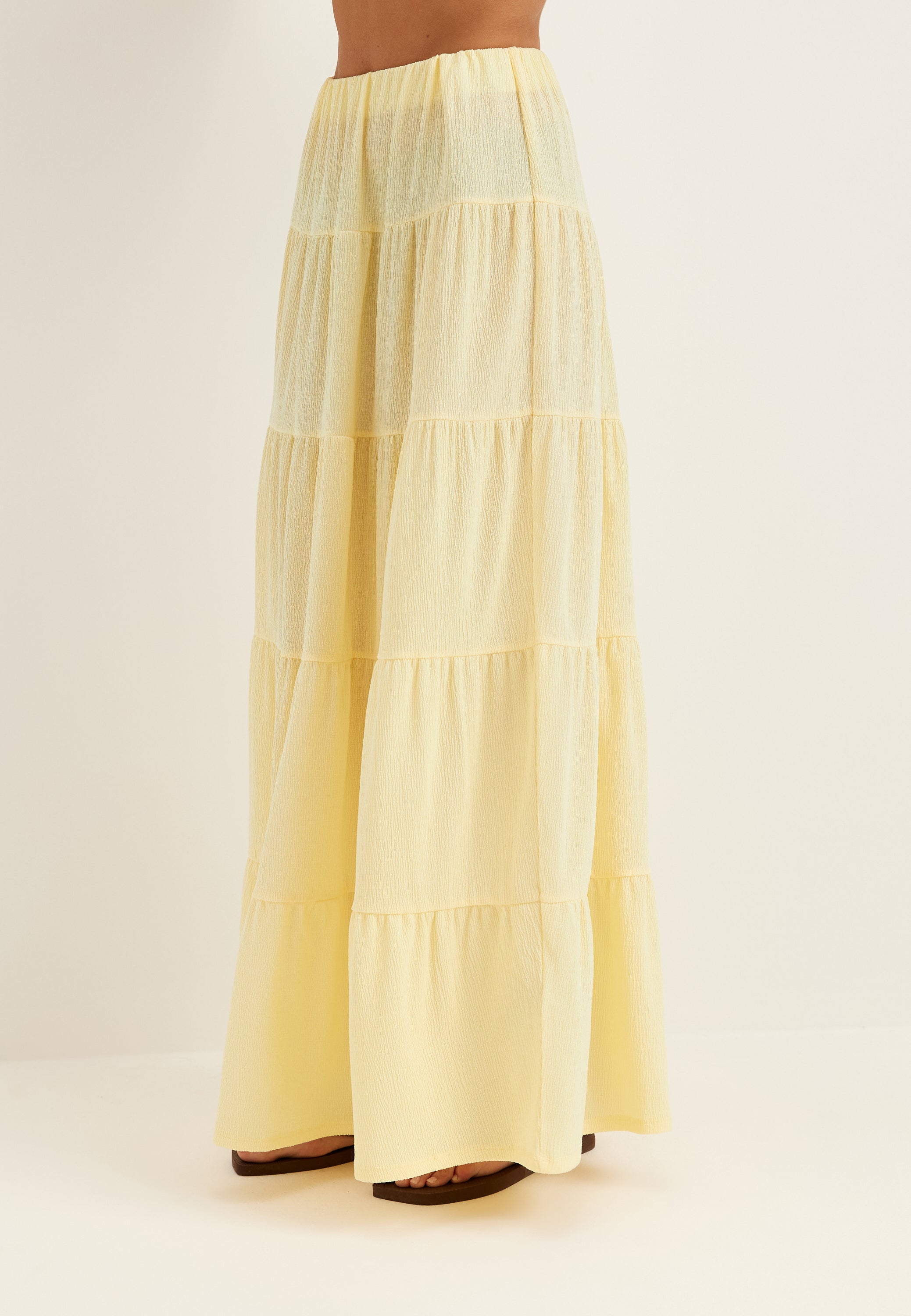 This maxi skirt is an easy, flowy style for everyday wear, weekends away, and dressed-up casual plans. The soft A-line shape and flounced tiers give it beautiful movement, while the light yellow tone adds a fresh, spring-ready feel that works just as well with a knit now as it does with a simple tank later on.