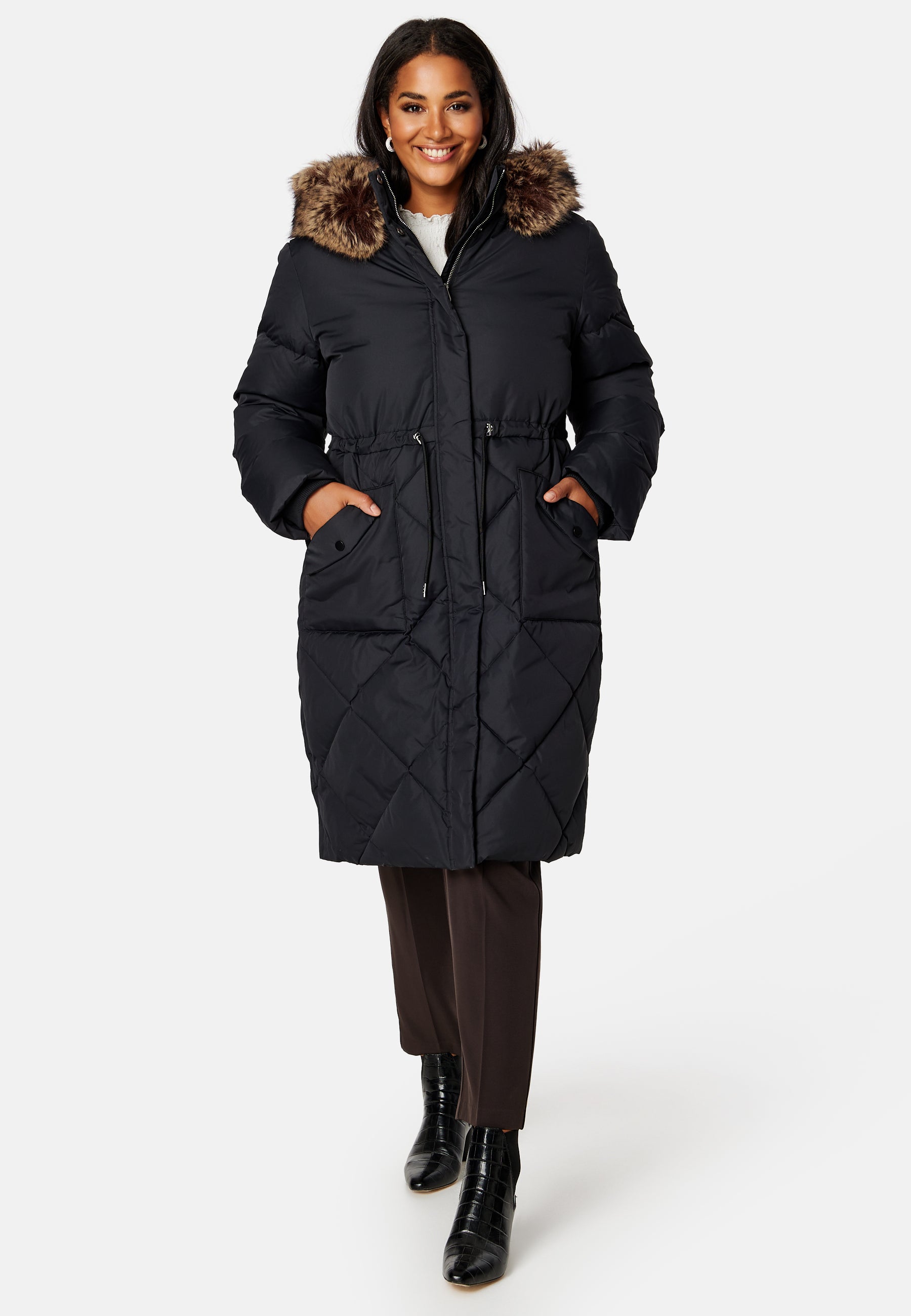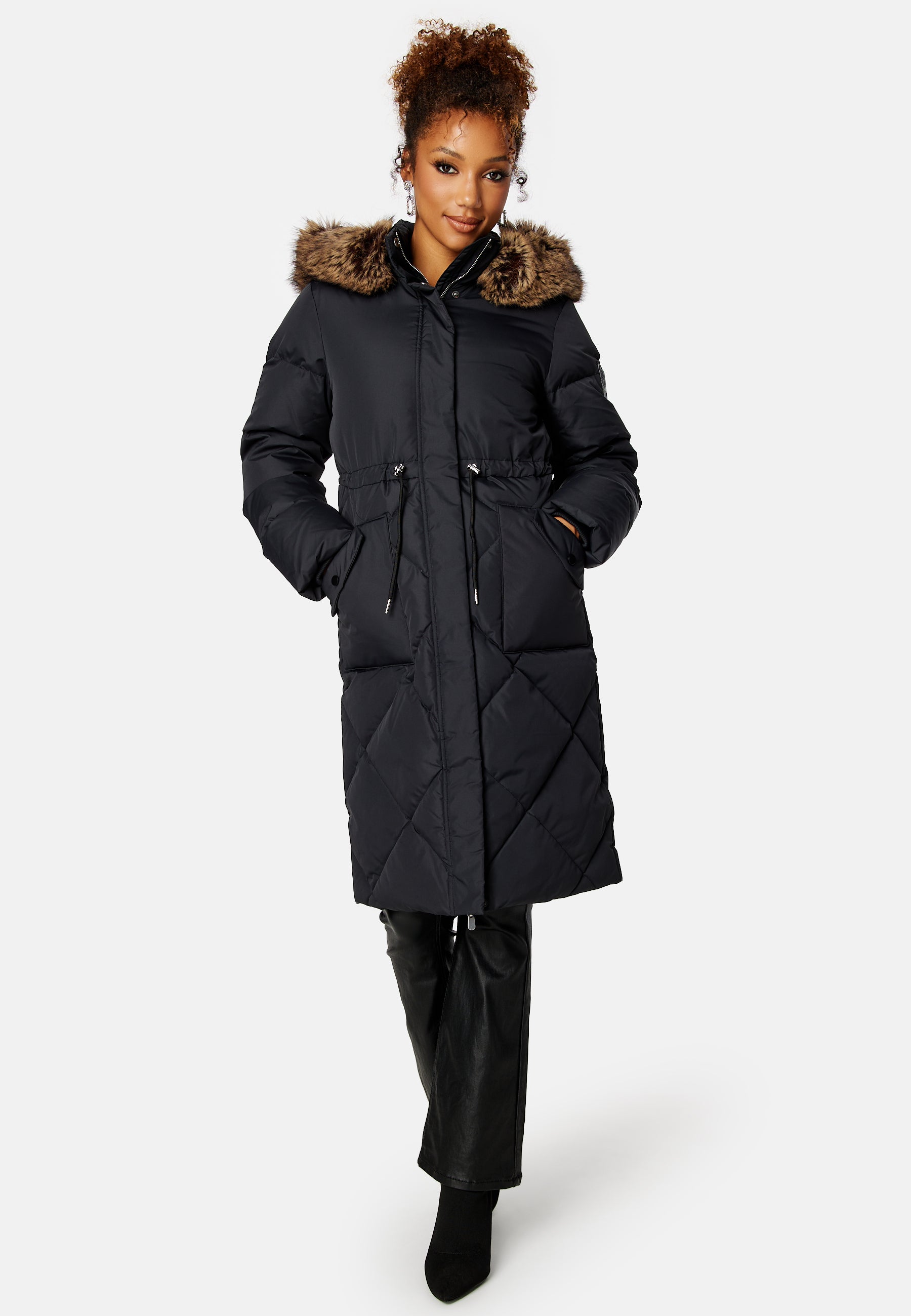 - Detachable faux fur.
