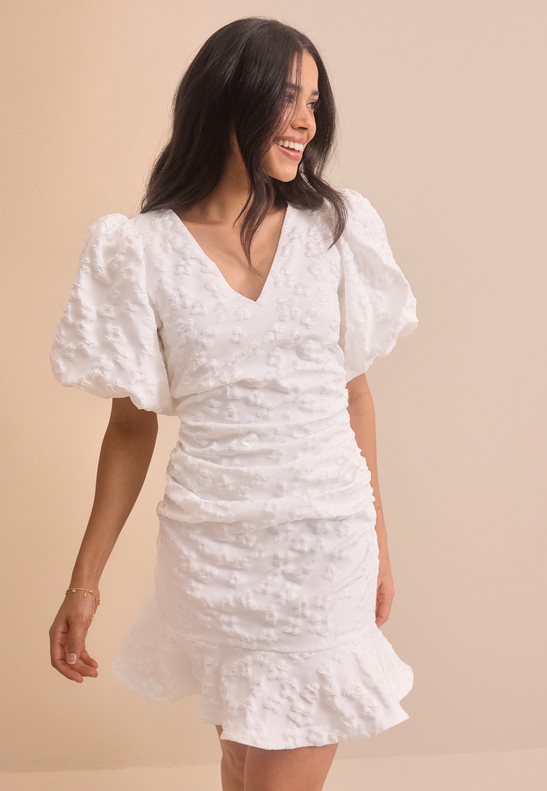 The fitted shape is balanced by the airy sleeves and subtle ruching through the body, which helps create a smooth, feminine silhouette. It’s the kind of short occasion dress that stands out from simpler white mini dresses thanks to the raised jacquard texture and playful movement at the hem.