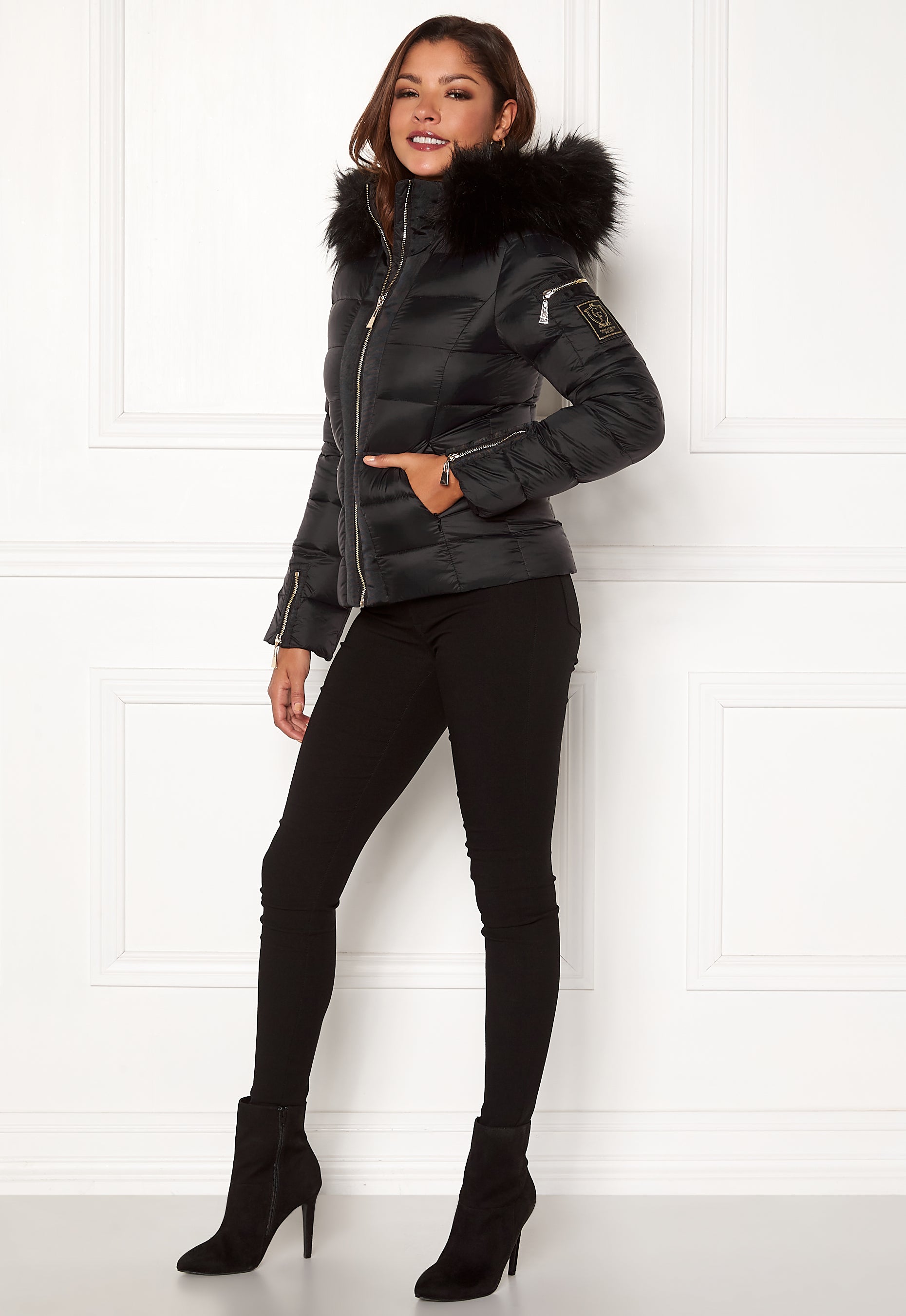 The jacket has a fluffy, detachable faux fur collar.