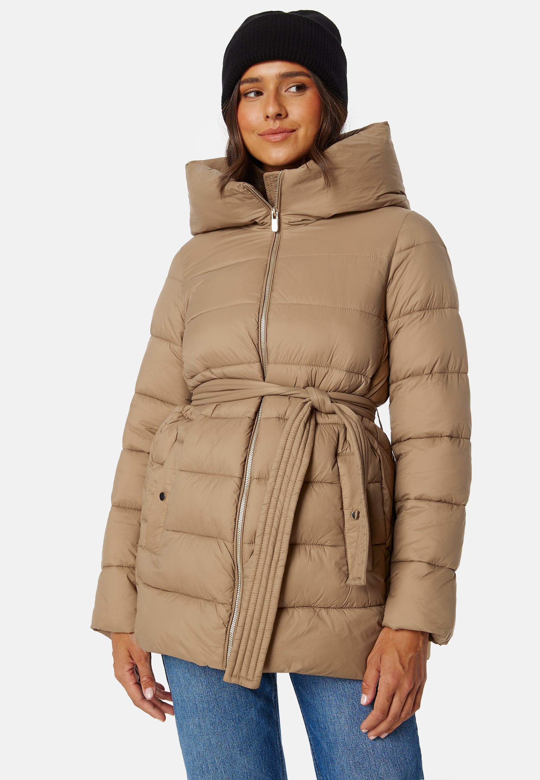 - Zip at the front with tie belt at the waist