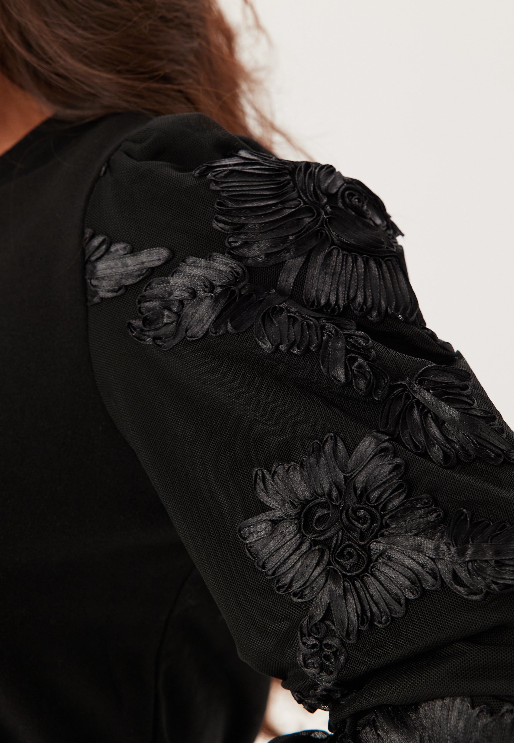 - 3D floral details on the sleeves.