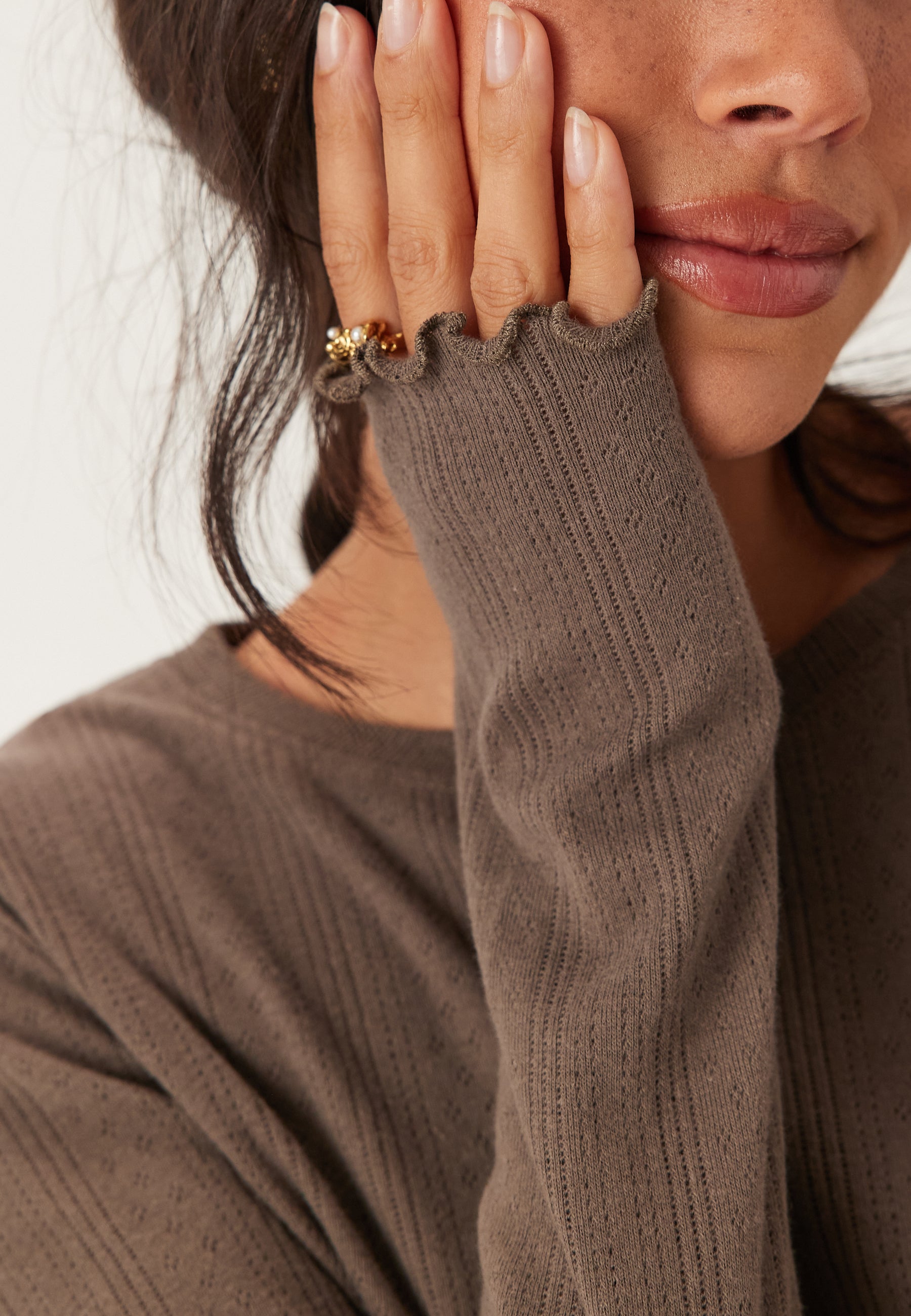 • This fitted long sleeve pointelle top is an easy everyday layer for jeans, tailored trousers, or skirts when you want something simple that still feels a bit more special. The soft stretchy fabric sits close to the body for a flattering fit, while the morel brown shade makes it especially easy to wear through the week and into the weekend.