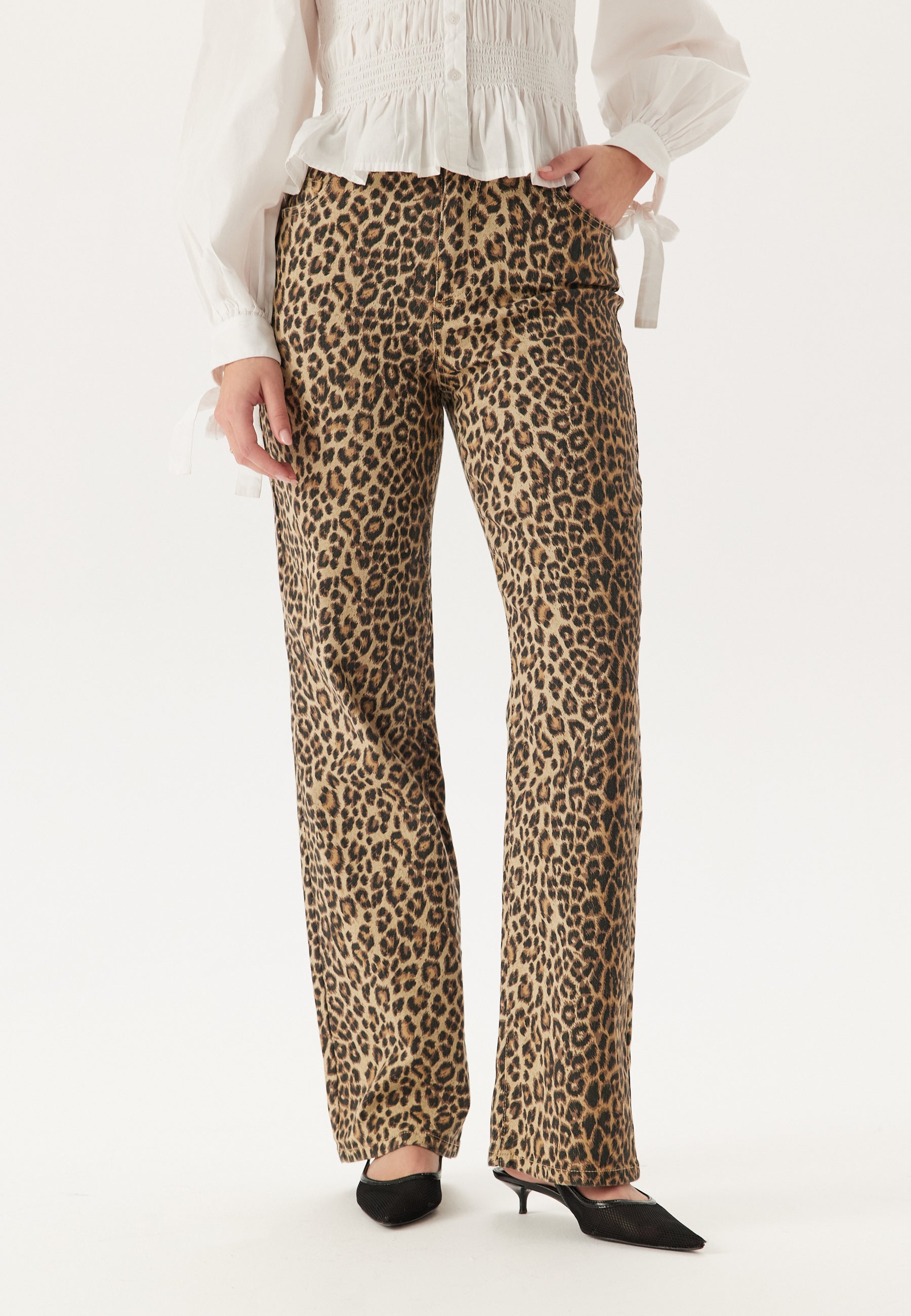 • Jeans by Pieces with a leopard pattern.