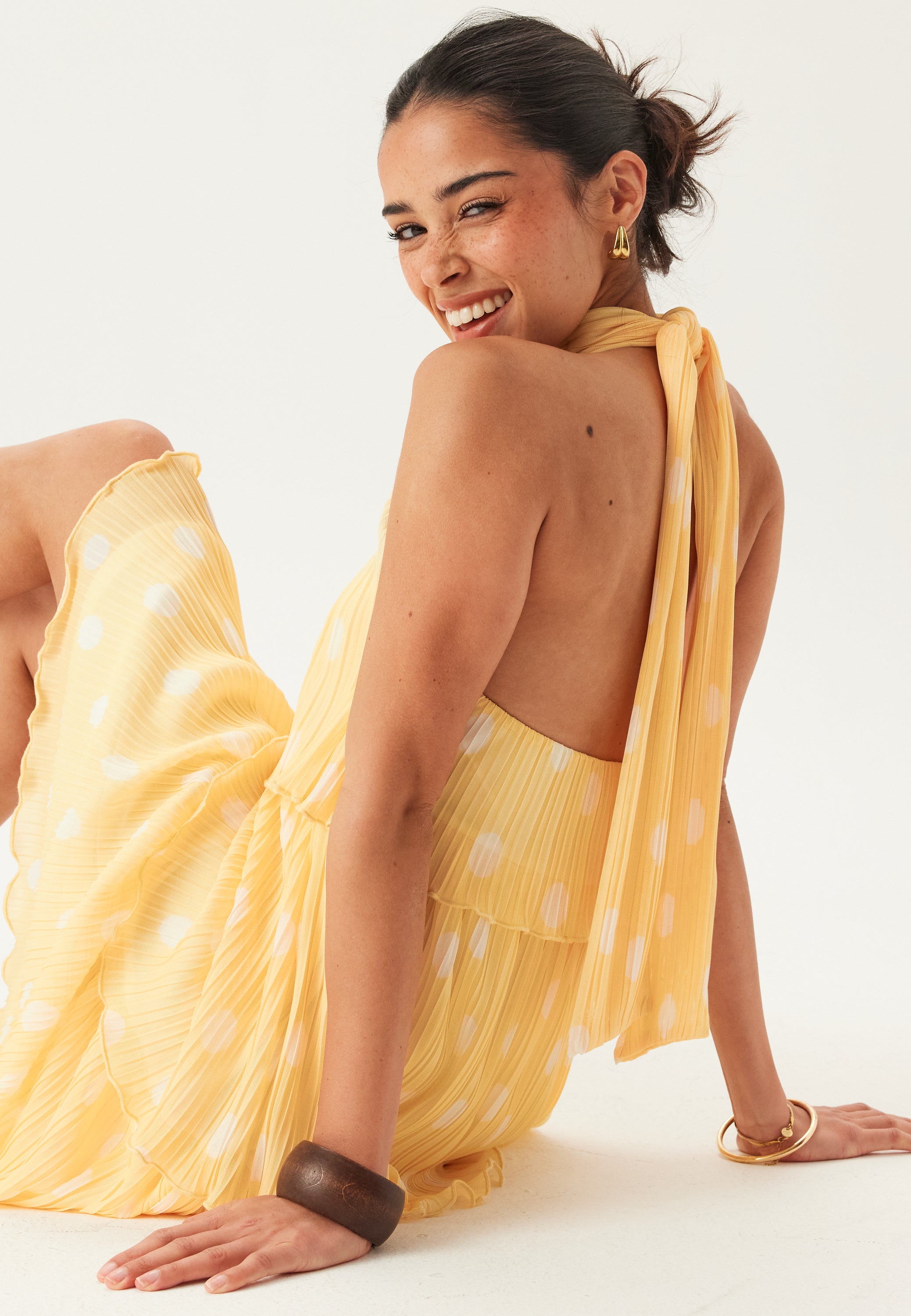 - Backless style with a tie strap at the neck