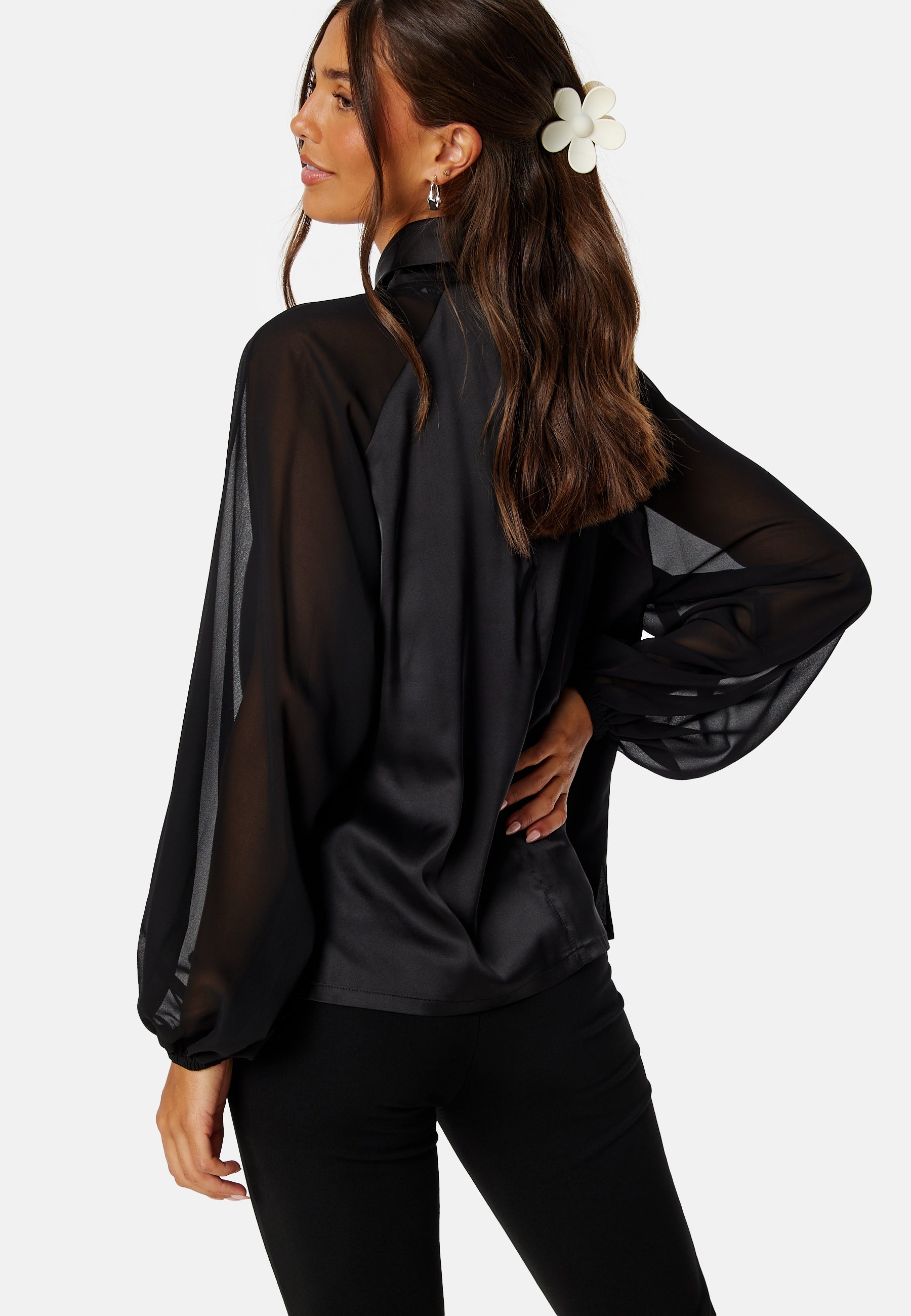- Woven, non-stretch quality with a chiffon weave on the sleeves.