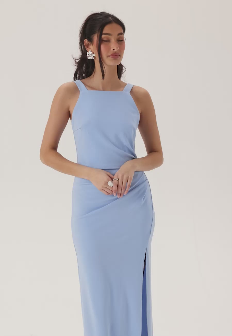 • This light blue maxi dress is a sleek formal dress for prom, bridesmaid duties, and wedding guests who want something clean, flattering, and easy to wear. The square neckline gives it a modern, polished look, while the high slit adds movement and just the right amount of shape through the skirt.
