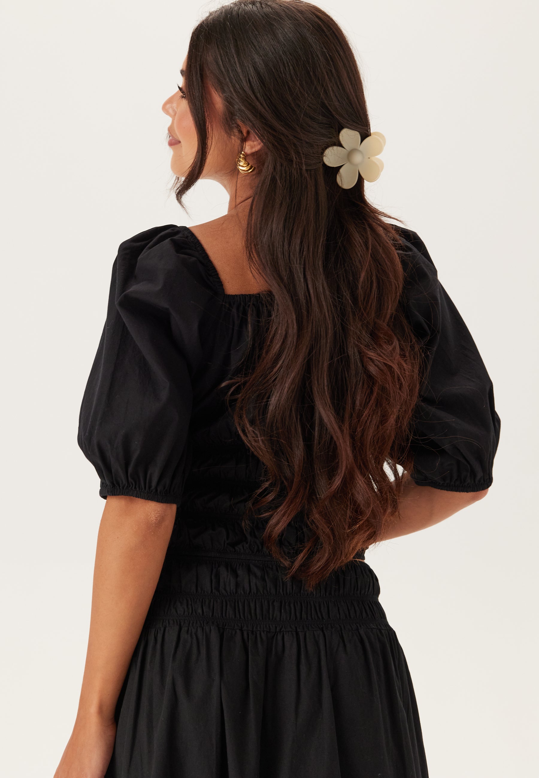 - Bubble sleeves with elastic on the sleeve ends.