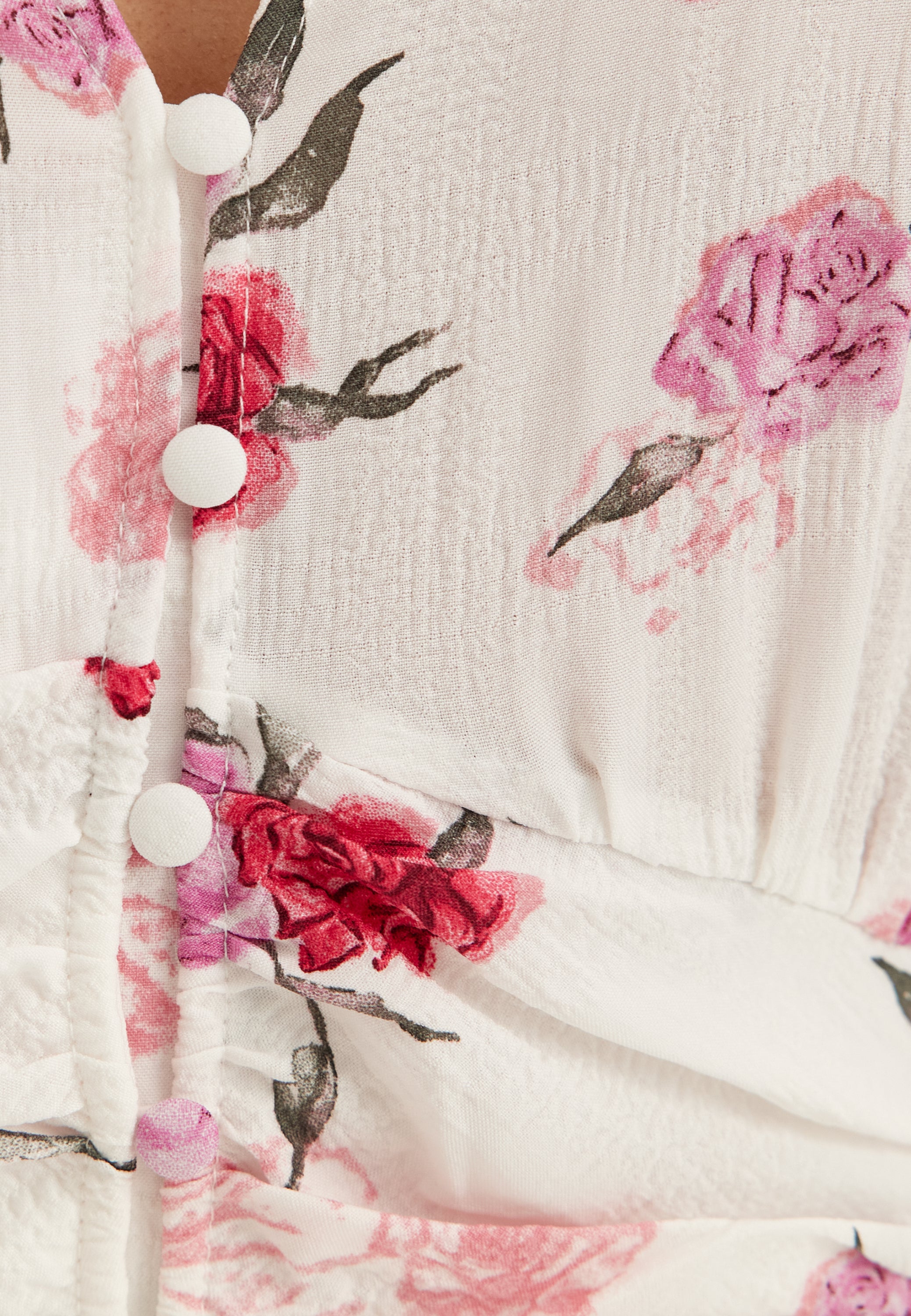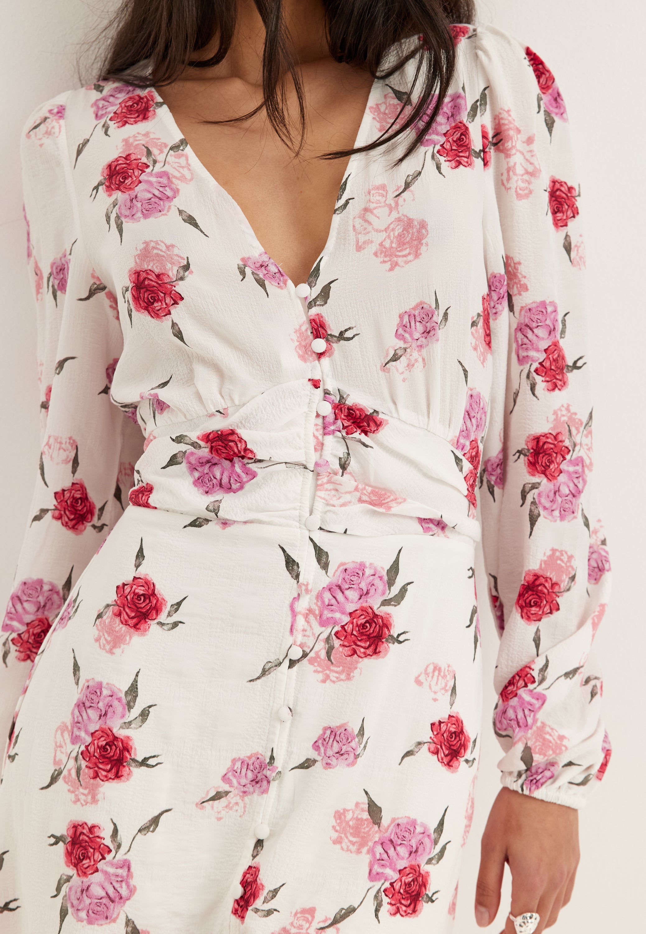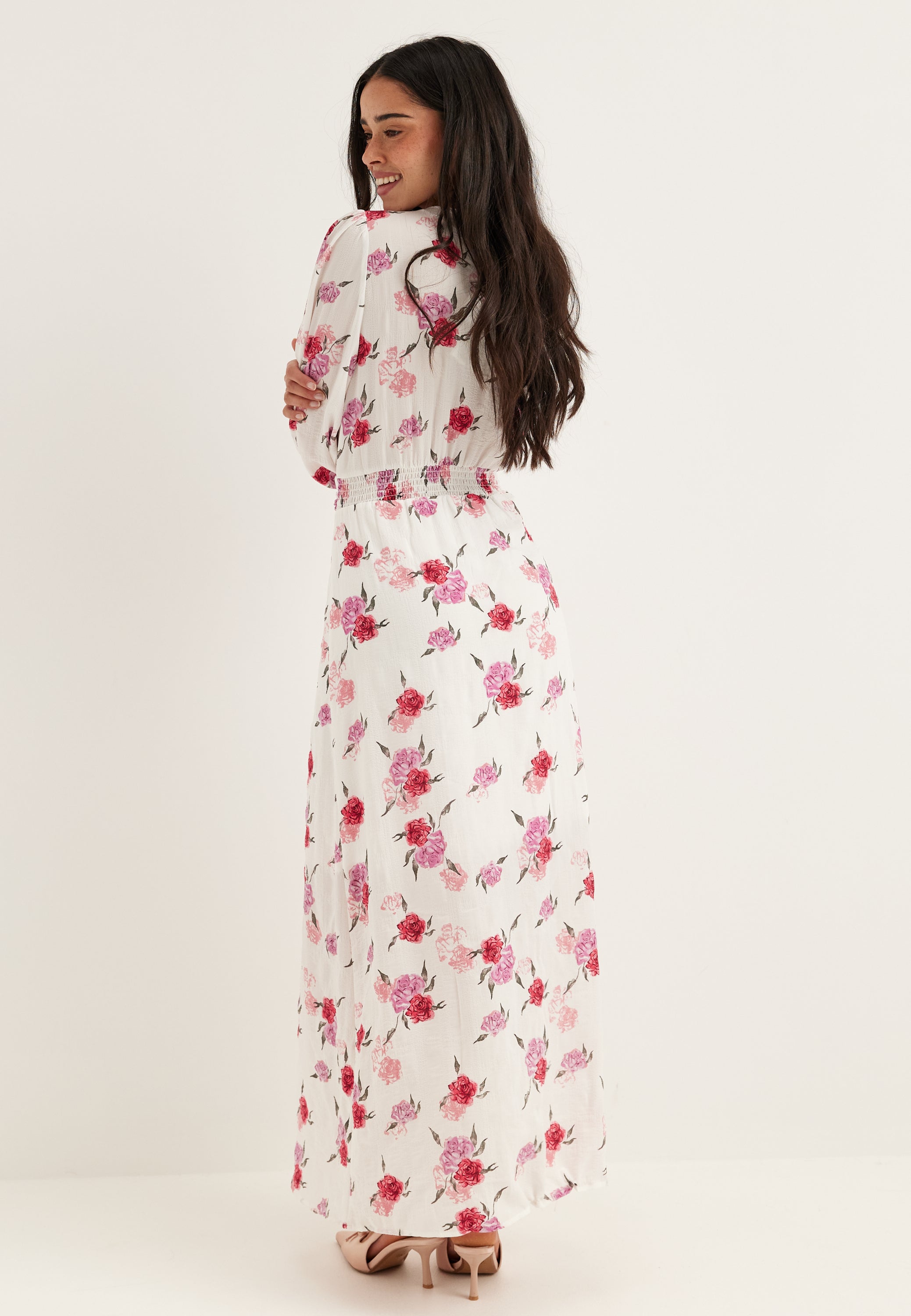 • This floral maxi dress is a long-sleeve wedding guest and occasion dress with a soft V-neck, front buttons, and a light, easy shape that feels dressed up without trying too hard. The white base with pink rose print gives it a fresh, romantic look that works beautifully for summer weddings, garden parties, and dinners when you want something feminine but still relaxed.