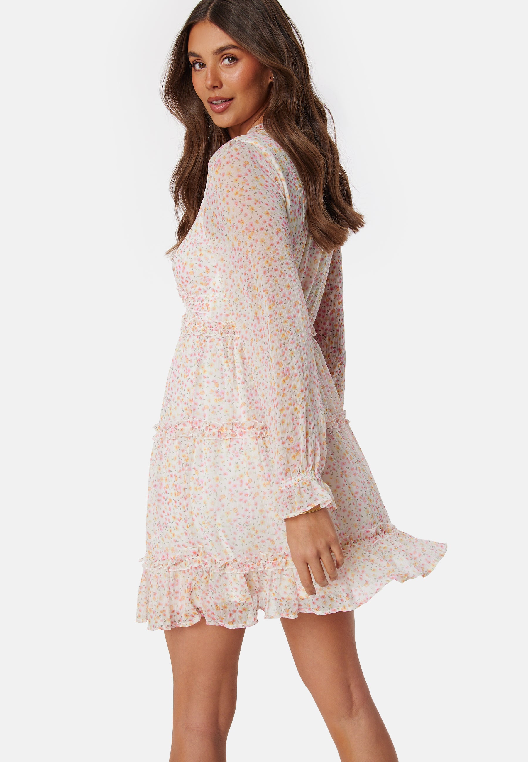 - Flounced v neckline.