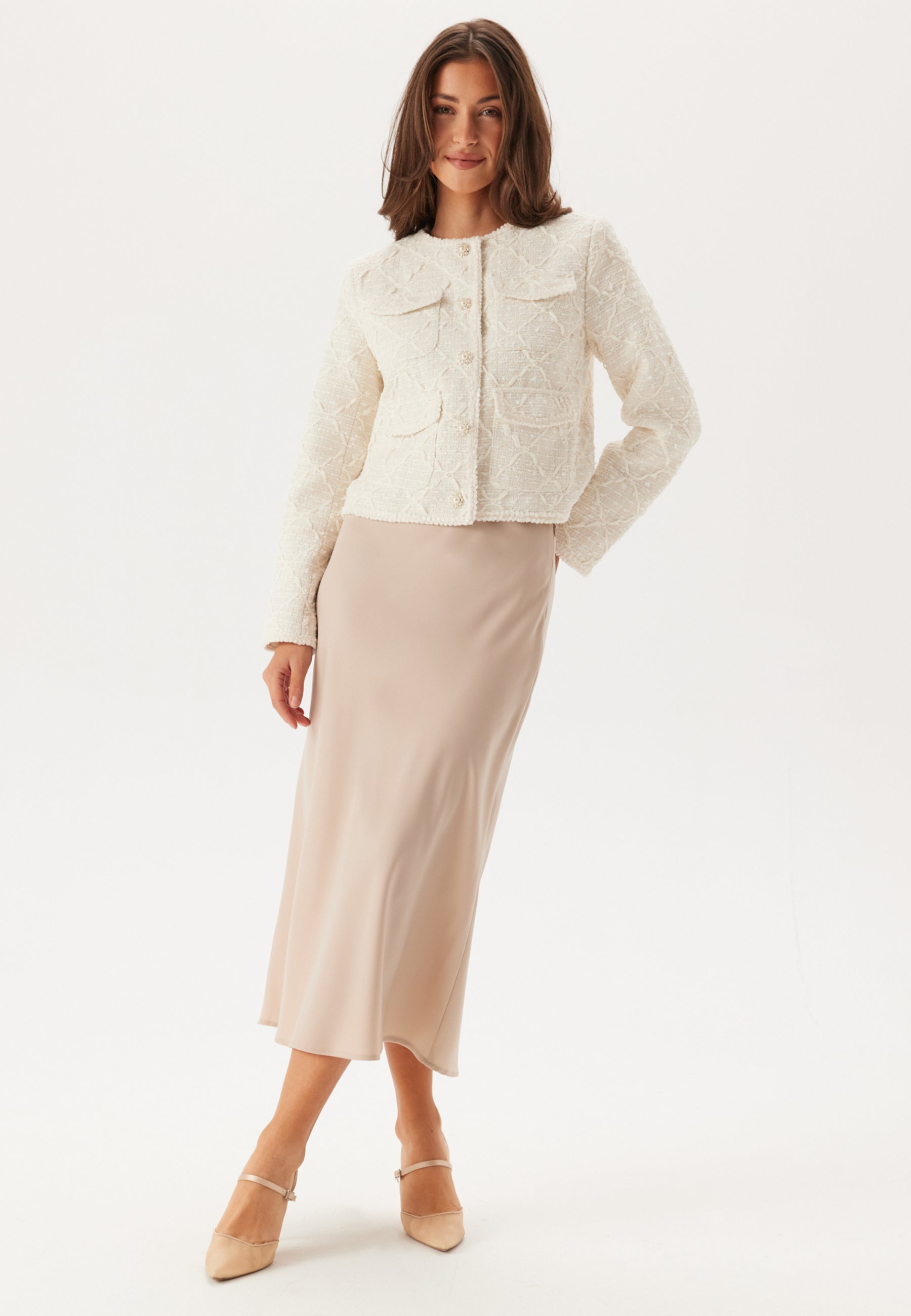 - Embellished button closure at the front.