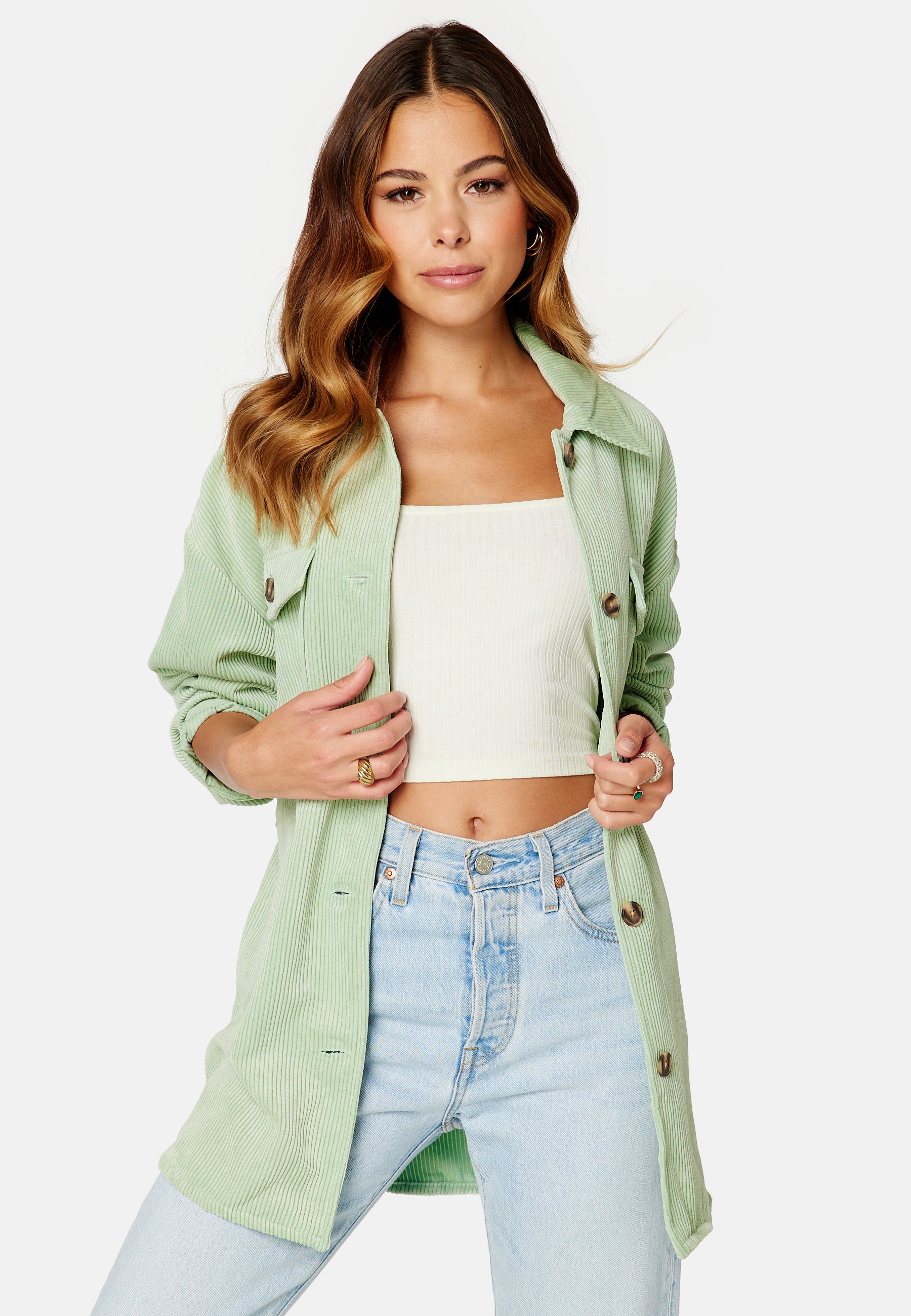 Fin skjortejakke i cord fra Pieces med et midjebånd.
