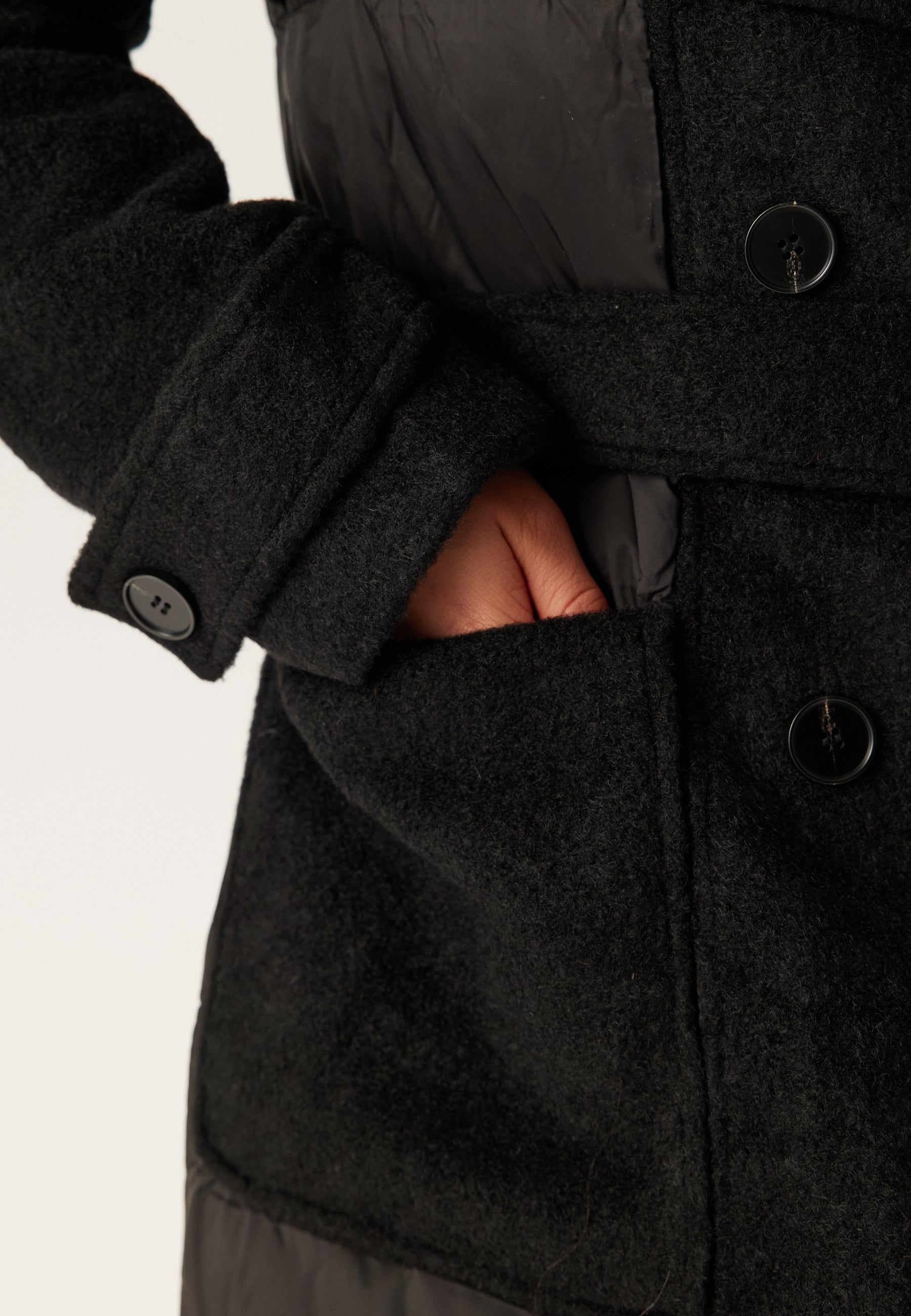 Ytterstoff: 100% Nylon Ytterstoff: 100% Polyester Foring: 100% Polyester Indre stoff: 100% Polyester Juksepelskrage: 100% Polyester