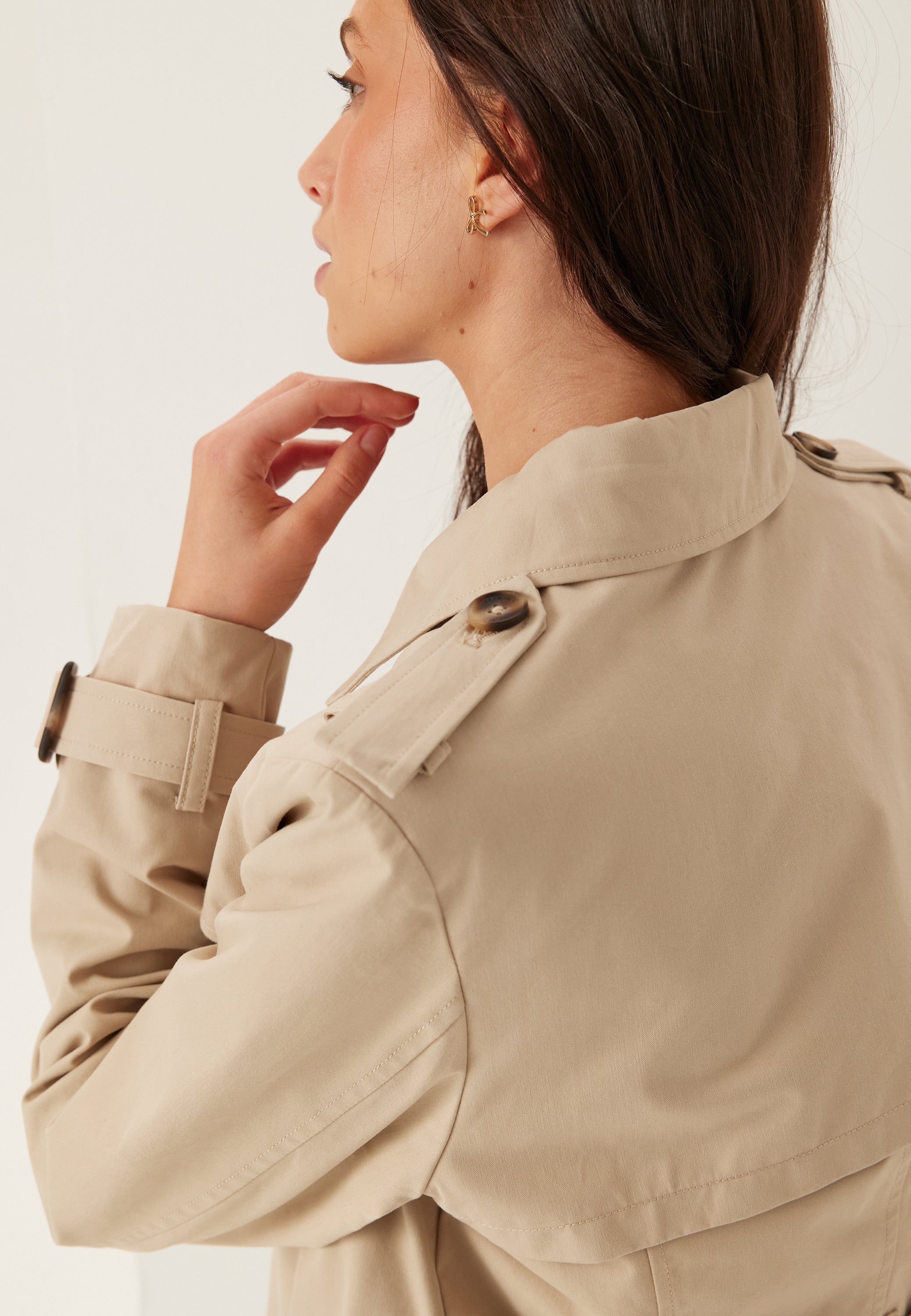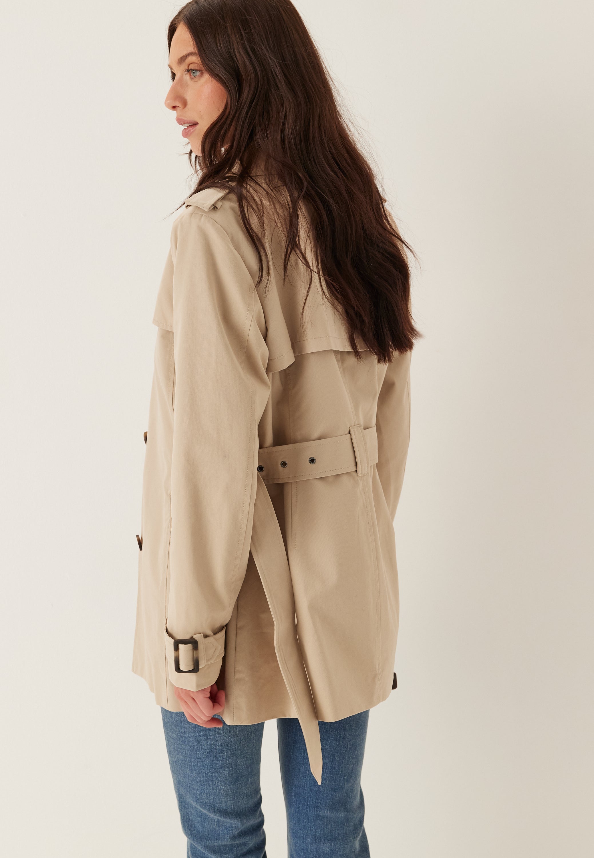 Denne beige trenchcoaten er en smart og lett jakke for vår, høst og hverdager i byen, med en ren, enkel knepping foran og et belte i livet som lar deg justere passformen. Den kortere lengden gir den et avslappet og moderne uttrykk, så den fungerer like fint over jeans og en strikkegenser som lag på lag på vei til jobb.