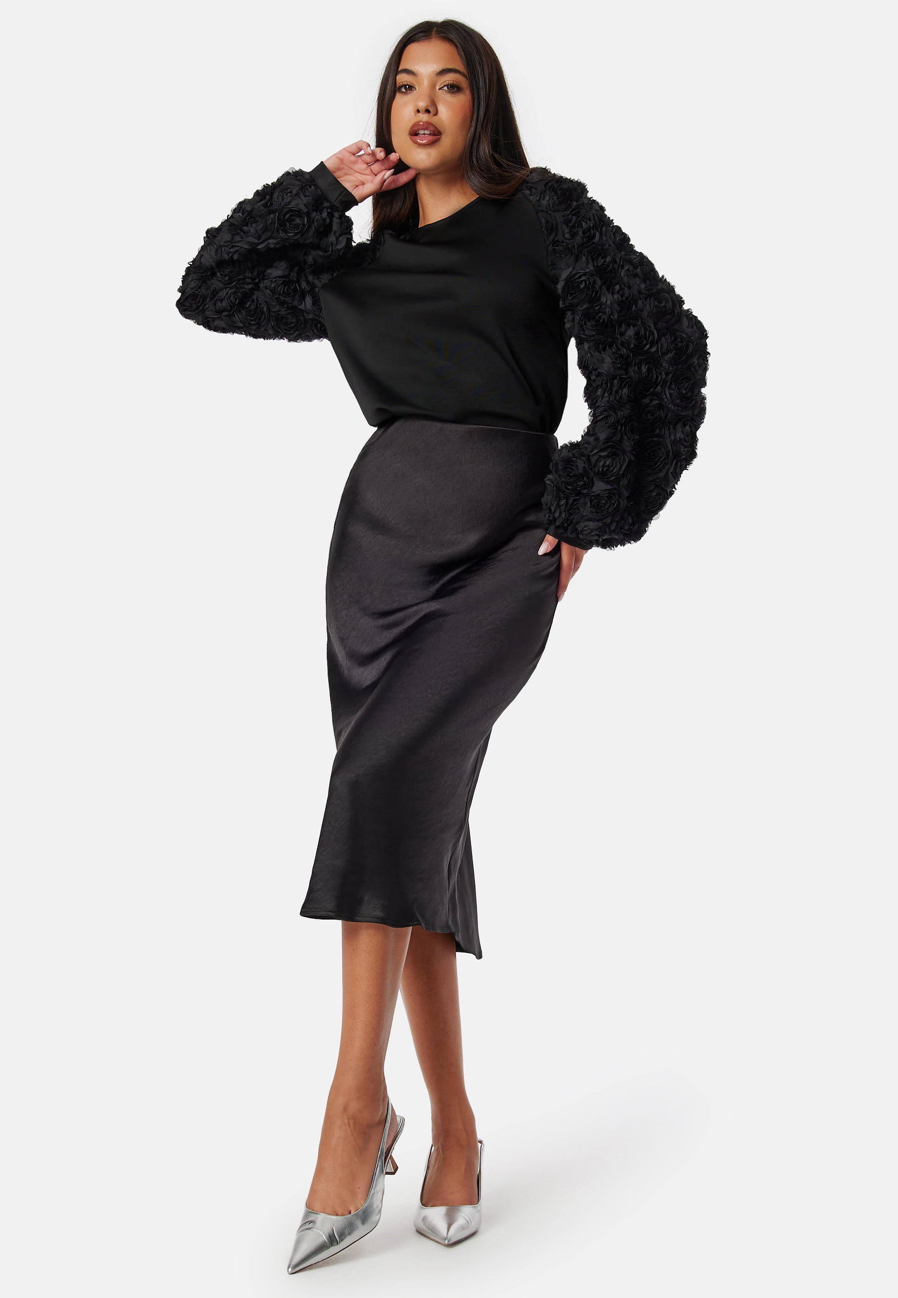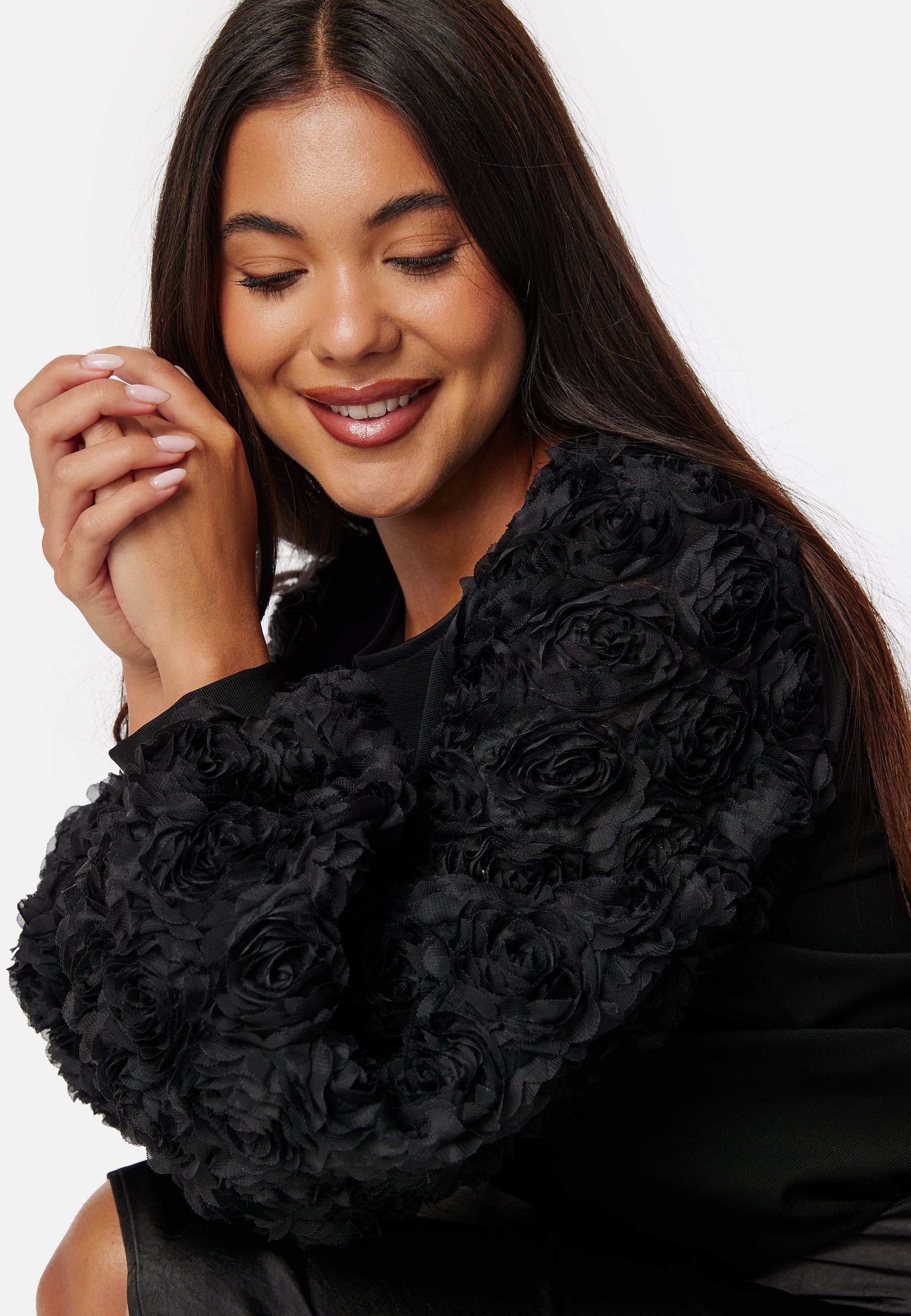 - 3D floral design on the sleeves.