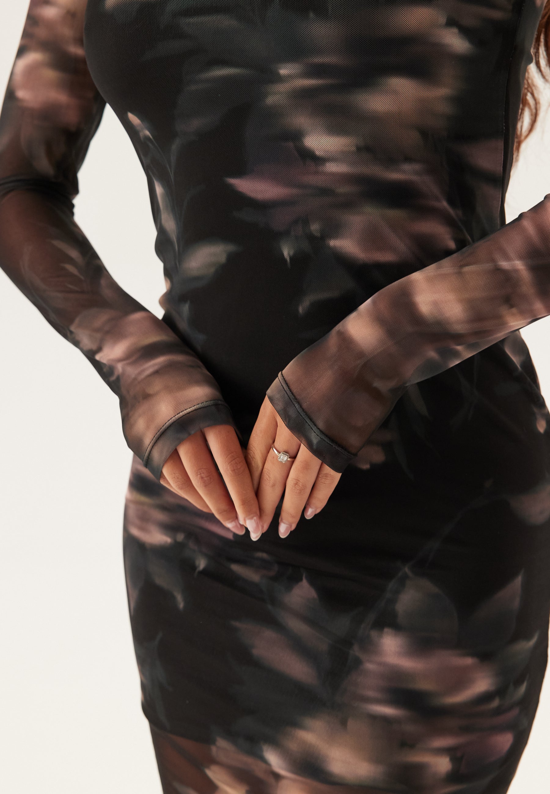 Denne langermede midi-kjolen i mesh er et sikkert valg til fest, middager og kveldsplaner når du vil ha en tettsittende passform med litt ekstra attitude. Den lett gjennomsiktige, stretchy meshen og det duse blomsterprintet i twilight mauve gir et mykere og mer stemningsfullt uttrykk enn en vanlig bodycon-kjole, mens fôret gjør den enkel å bruke.