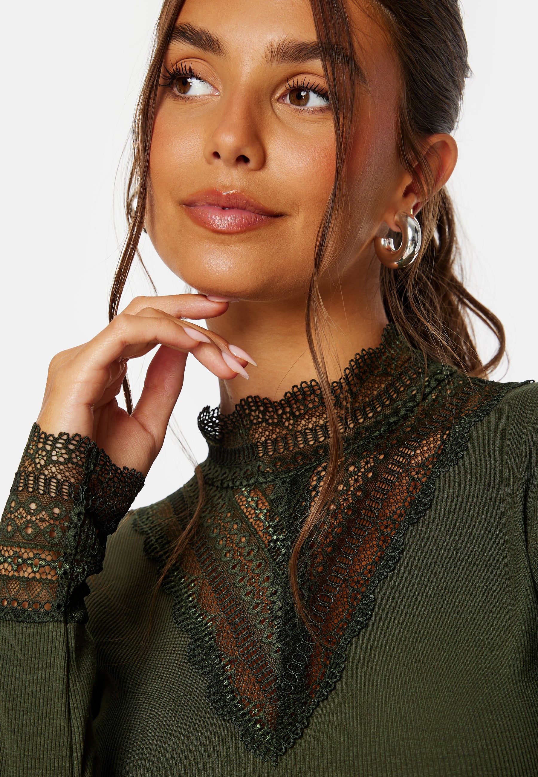 - Høy hals i v-formet blonde