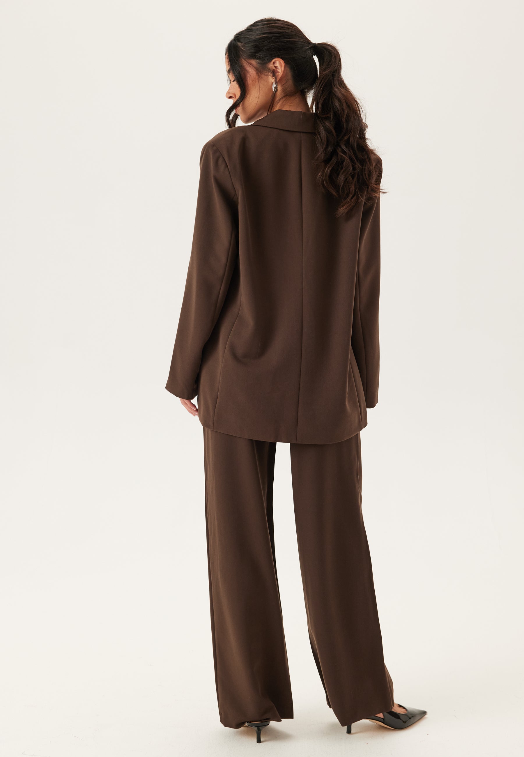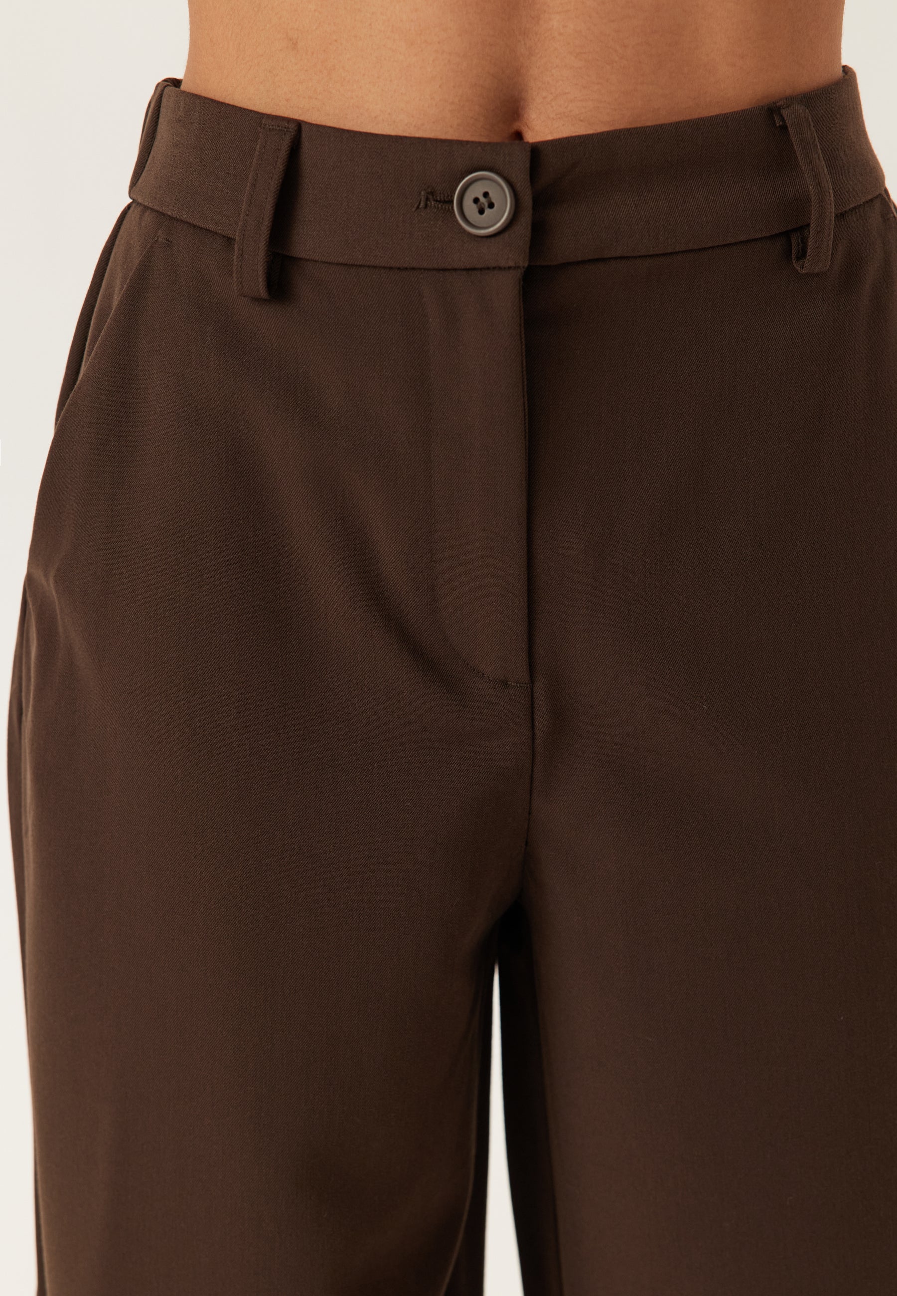 Det som gjør dem ekstra enkle å bruke, er kombinasjonen av struktur og komfort: Linningen sitter høyt, med strikk bak for en mer fleksibel passform i livet. Lommene foran gjør dem praktiske, og beltehempene og glidelåsgylfen gir den klassiske, skreddersydde finishen. Den dype bruntonen føles mykere enn svart, men er minst like anvendelig, noe som gjør disse buksene til et godt valg både til kontoret, finere anledninger eller til hverdags med en t-skjorte og blazer.