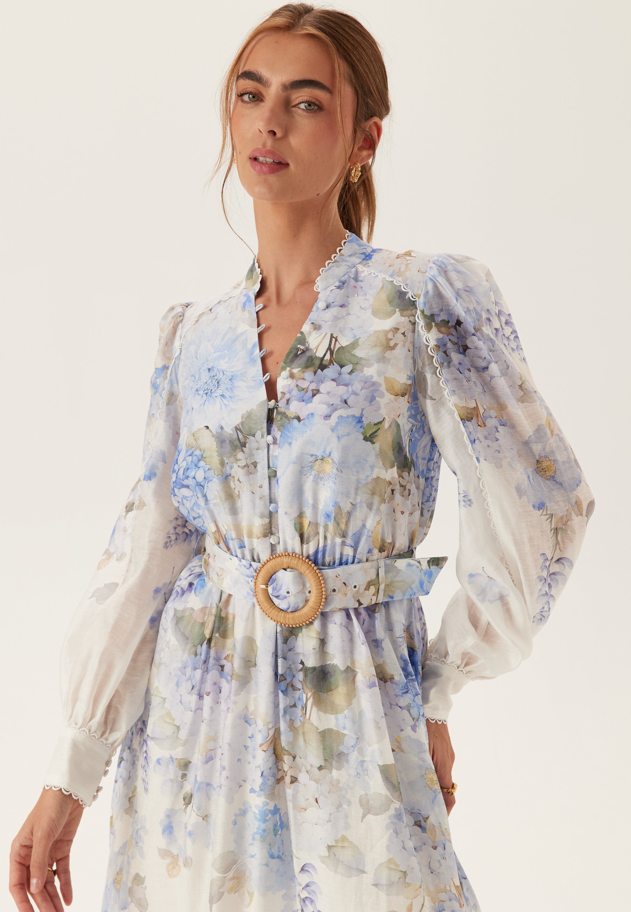 Denne blomstrete midikjolen er et enkelt valg til bryllup, hagefester og pyntede planer på dagtid, med et mykt blått og hvitt print, lange puffermer og en markert midje som gir et velkledd, men fortsatt lett uttrykk. Det vevde stoffet uten stretch holder fasongen fin, mens det flytende skjørtet gir fin bevegelse når du går.
