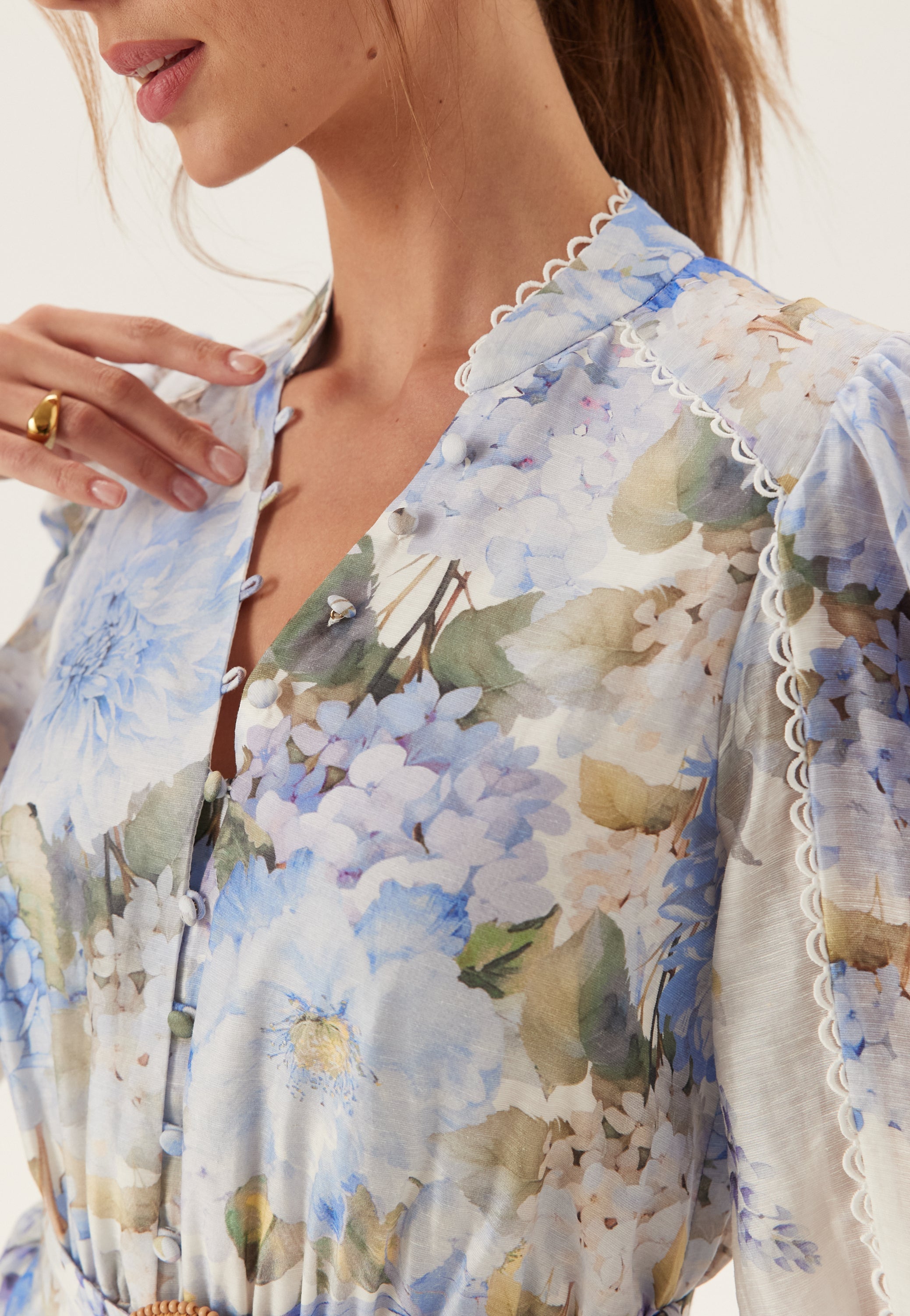 På nært hold er det kantdetaljene som gjør den ekstra spesiell. Den runde halsen, trukne knapper foran og nederst på ermene, og volangdetaljene øverst gir en romantisk finish uten at det føles for mye. Det avtakbare beltet i midjen lar deg variere silhuetten etter hvordan du vil bruke den, enten du liker den innsvinget eller litt mer avslappet.