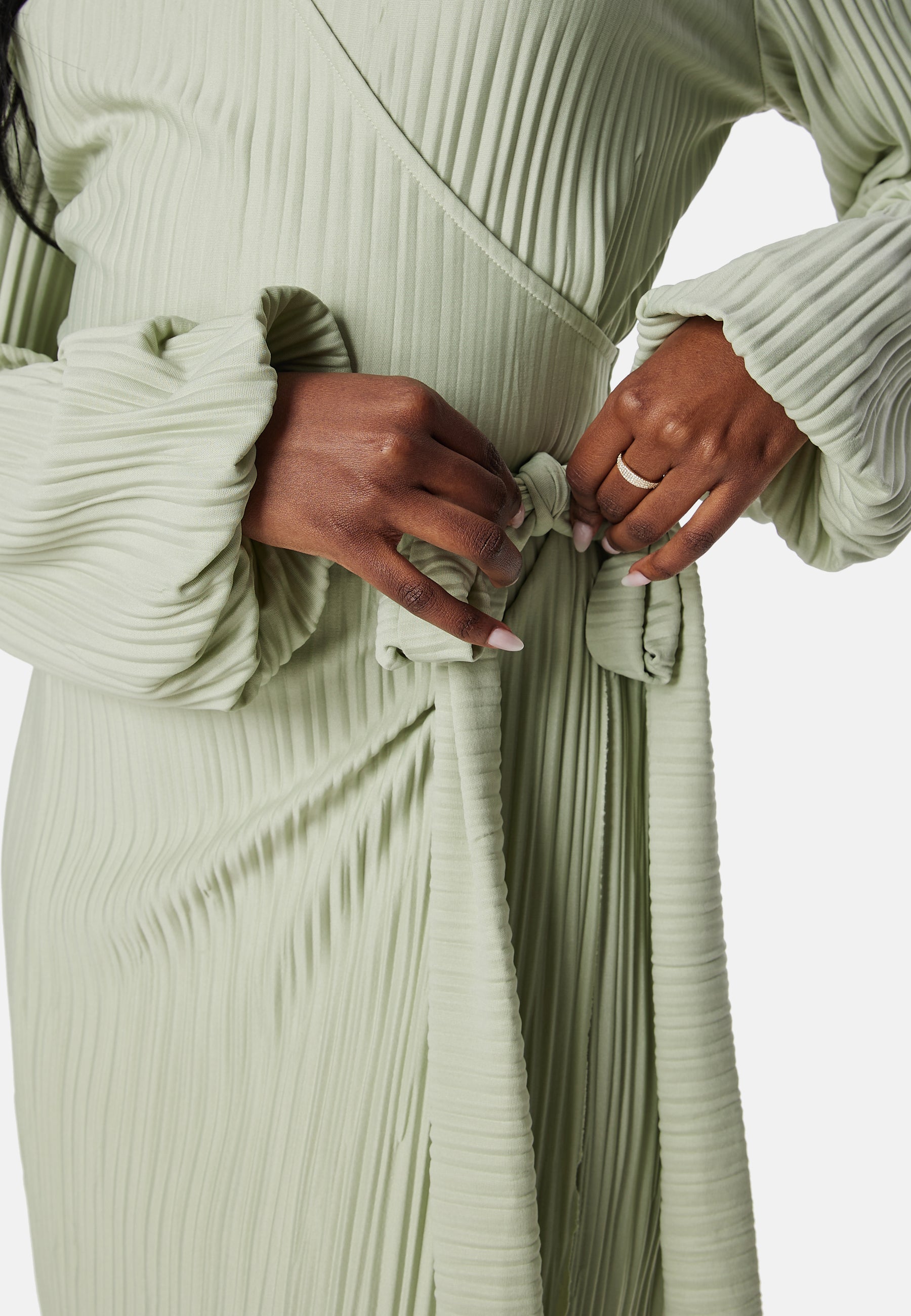 Plissert omslagskjole fra BUBBLEROOM. - Knytbar detalj på venstre side.