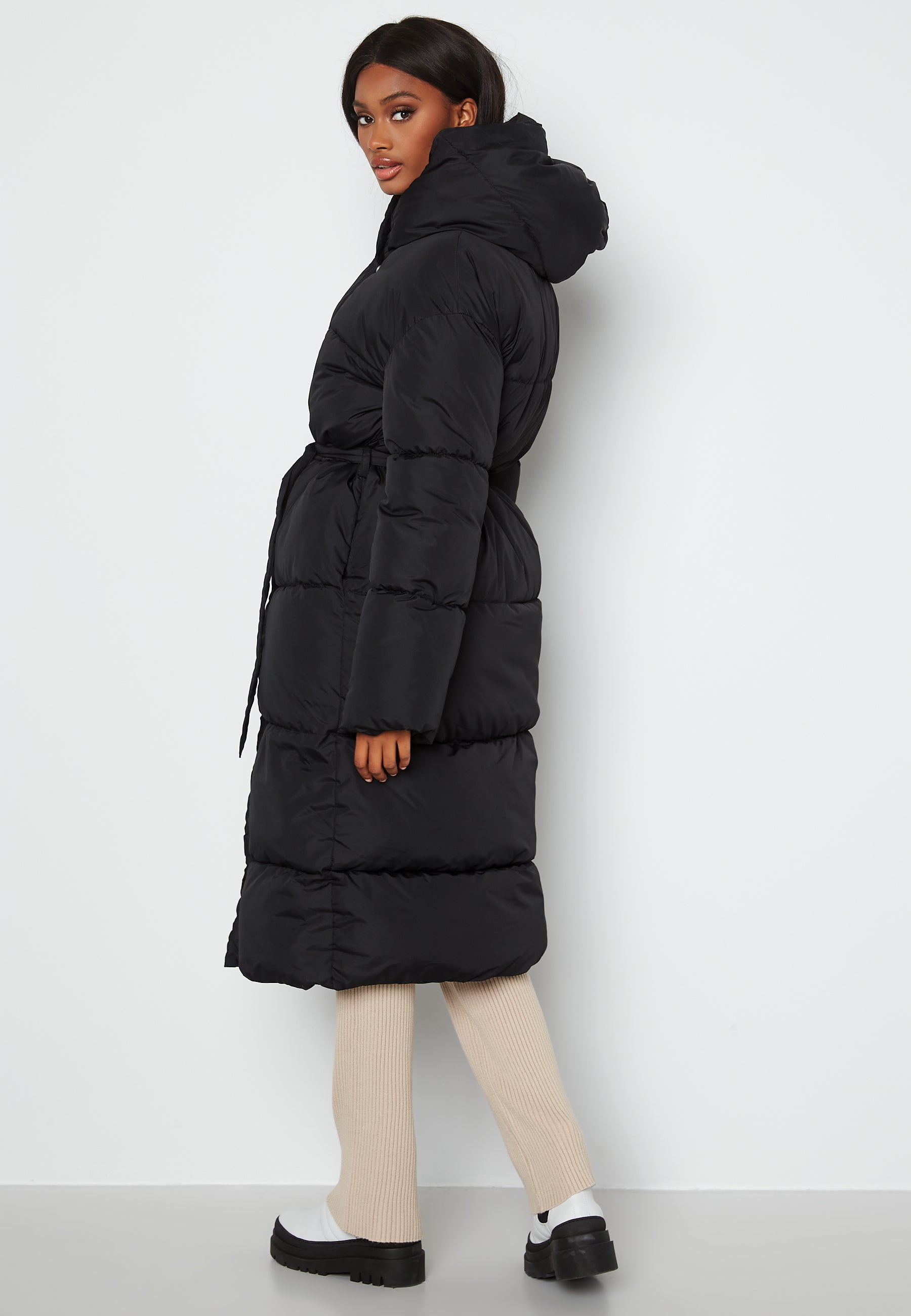 Fluffy, trendy, stilren kåpe med en knytbar tråd ved midjen.