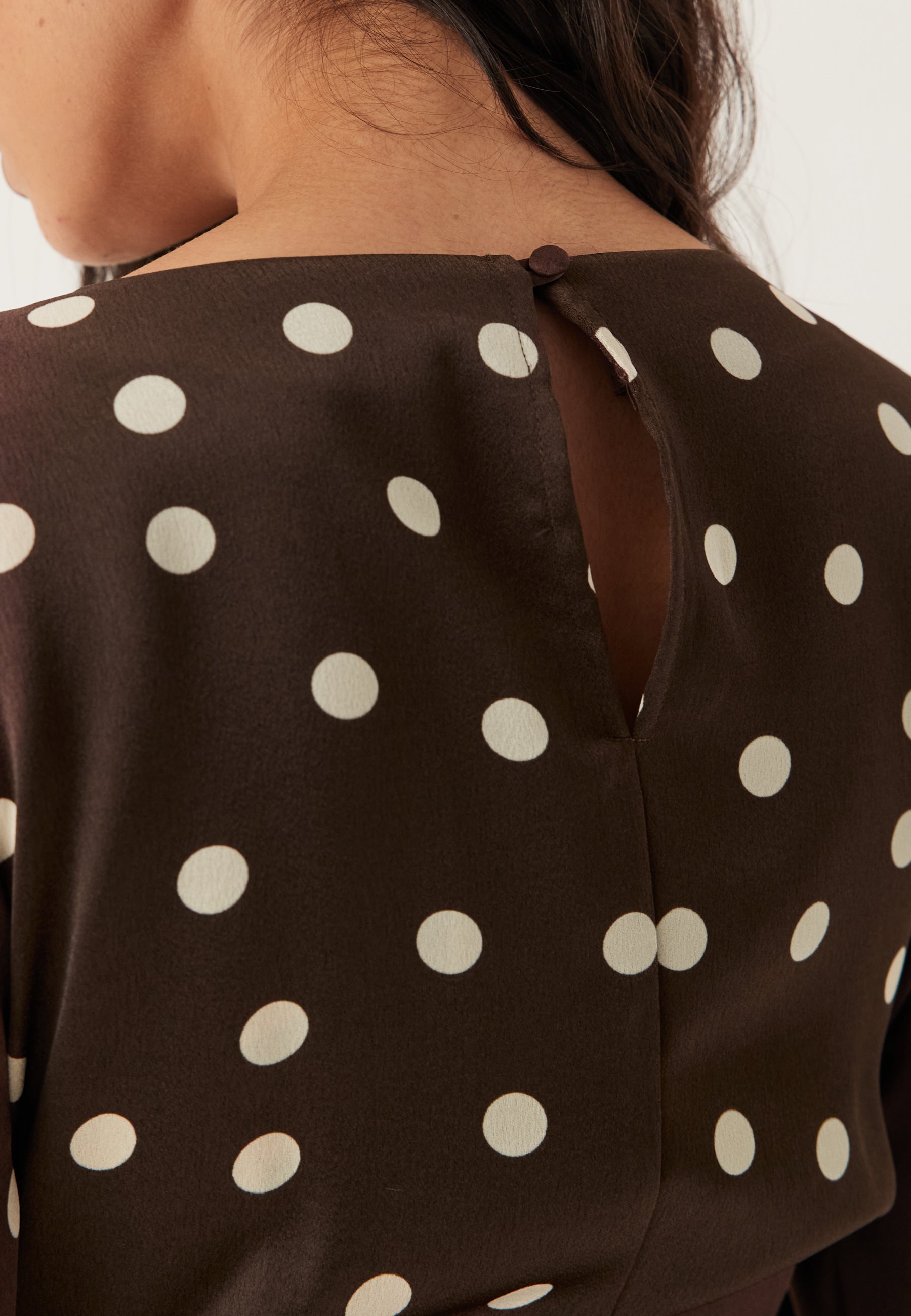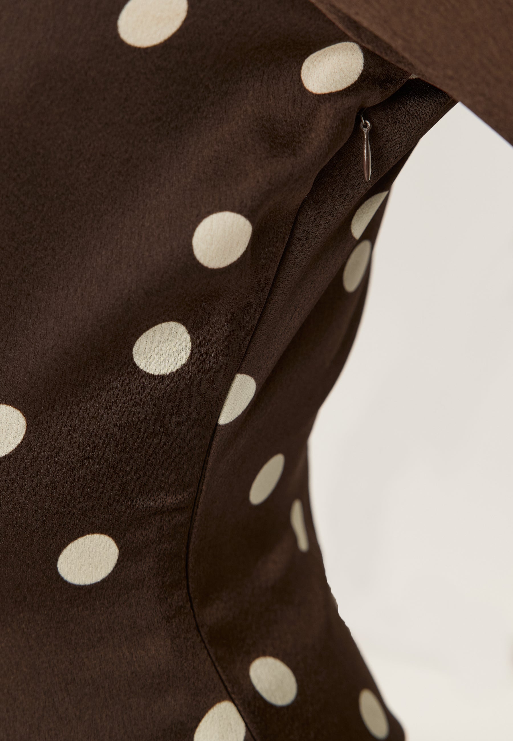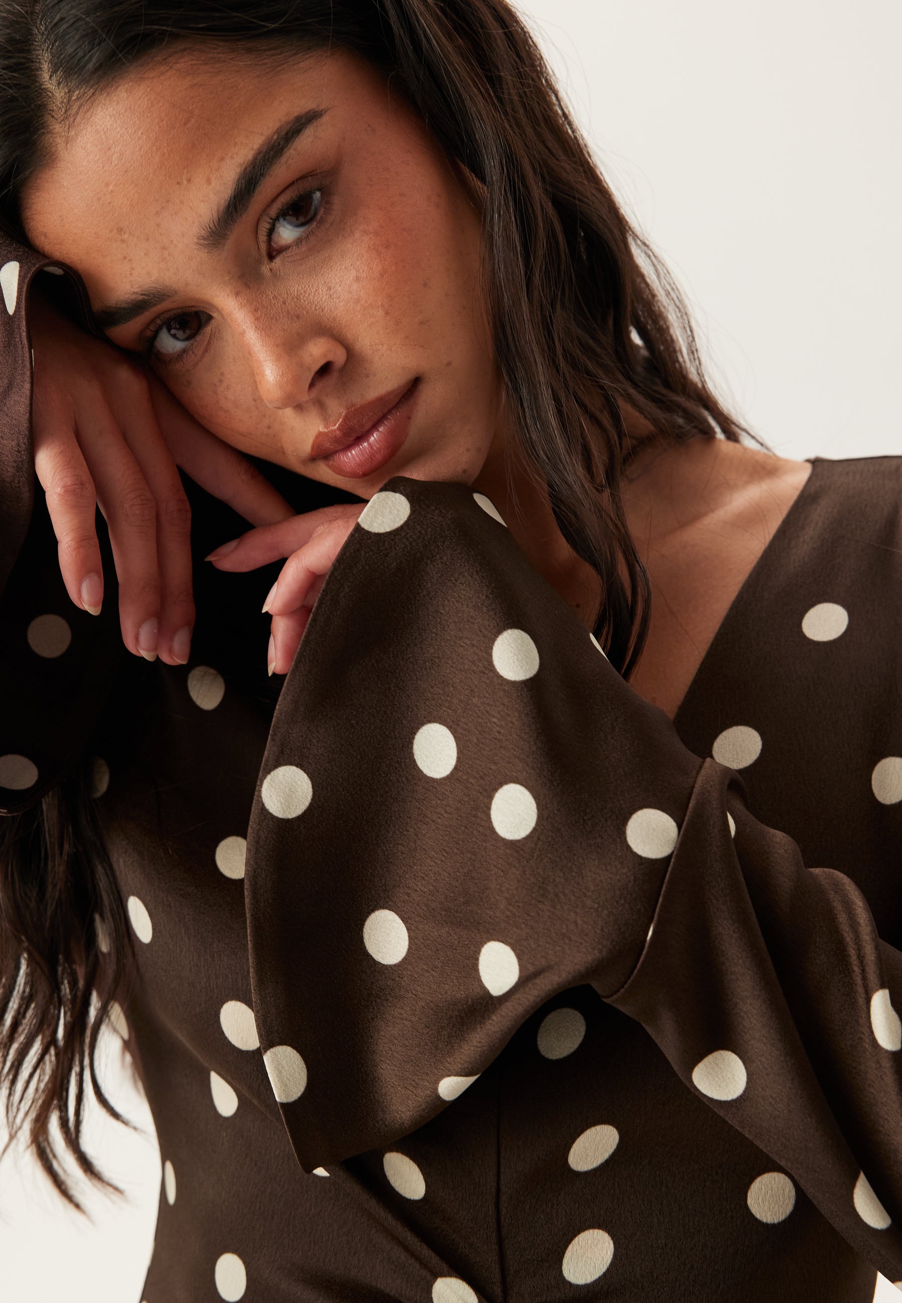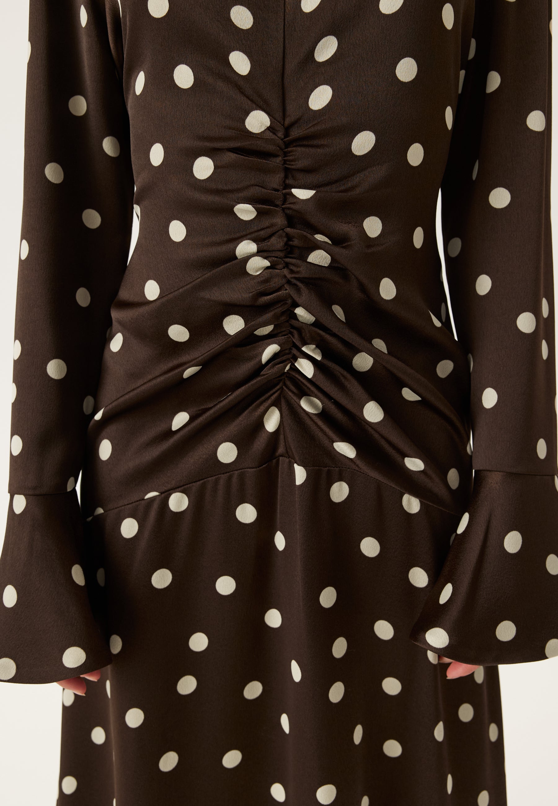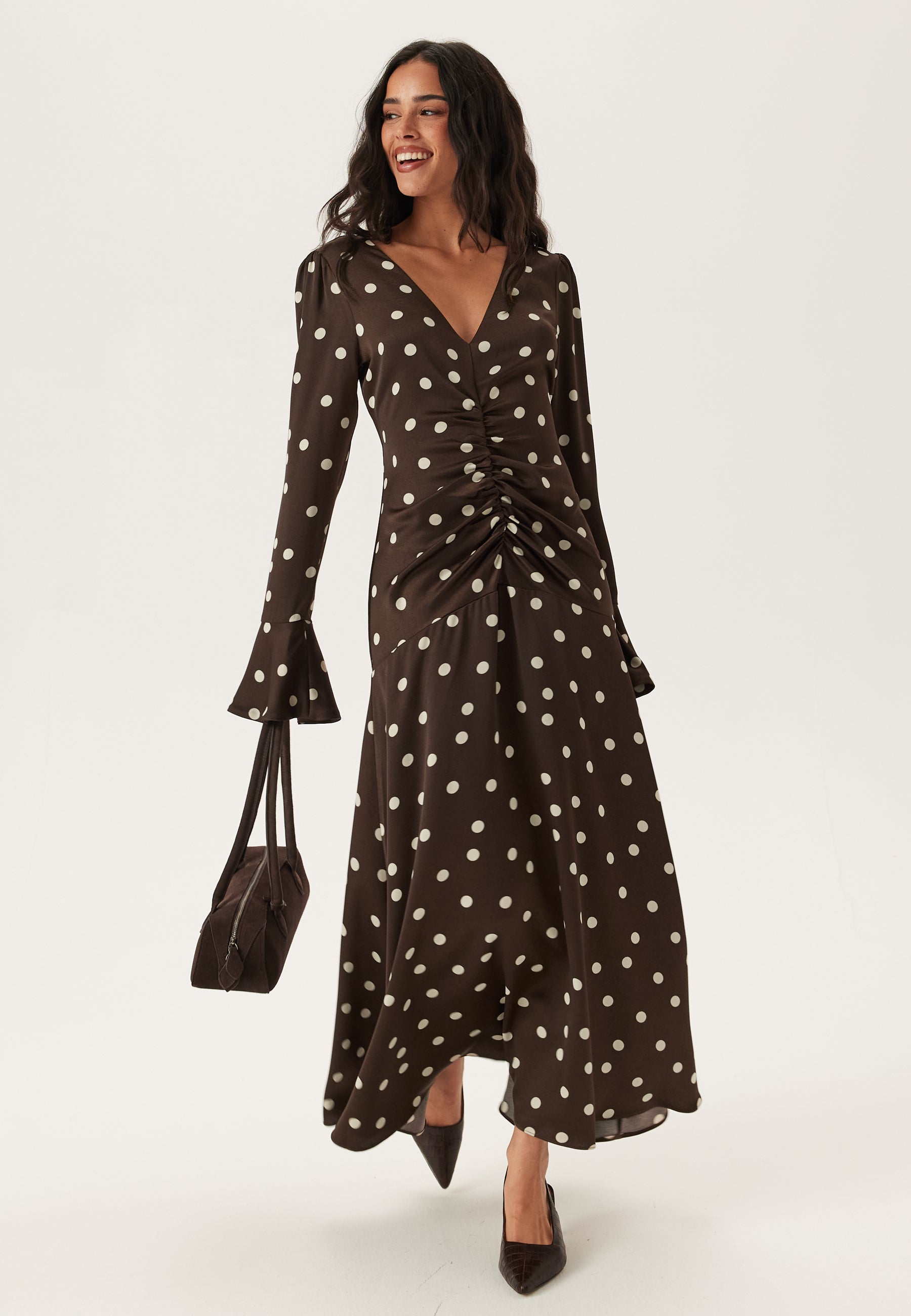 Denne satengkjolen i midi-lengde med lange ermer og brunt prikkemønster er perfekt til bryllup, middagsplaner og festkvelder når du vil føle deg velkledd uten å gjøre for mye ut av det. Det lett glansfulle, vevde stoffet faller fint, mens rynkingen midt foran trekker blikket inn og gir en flatterende, formet silhuett.
