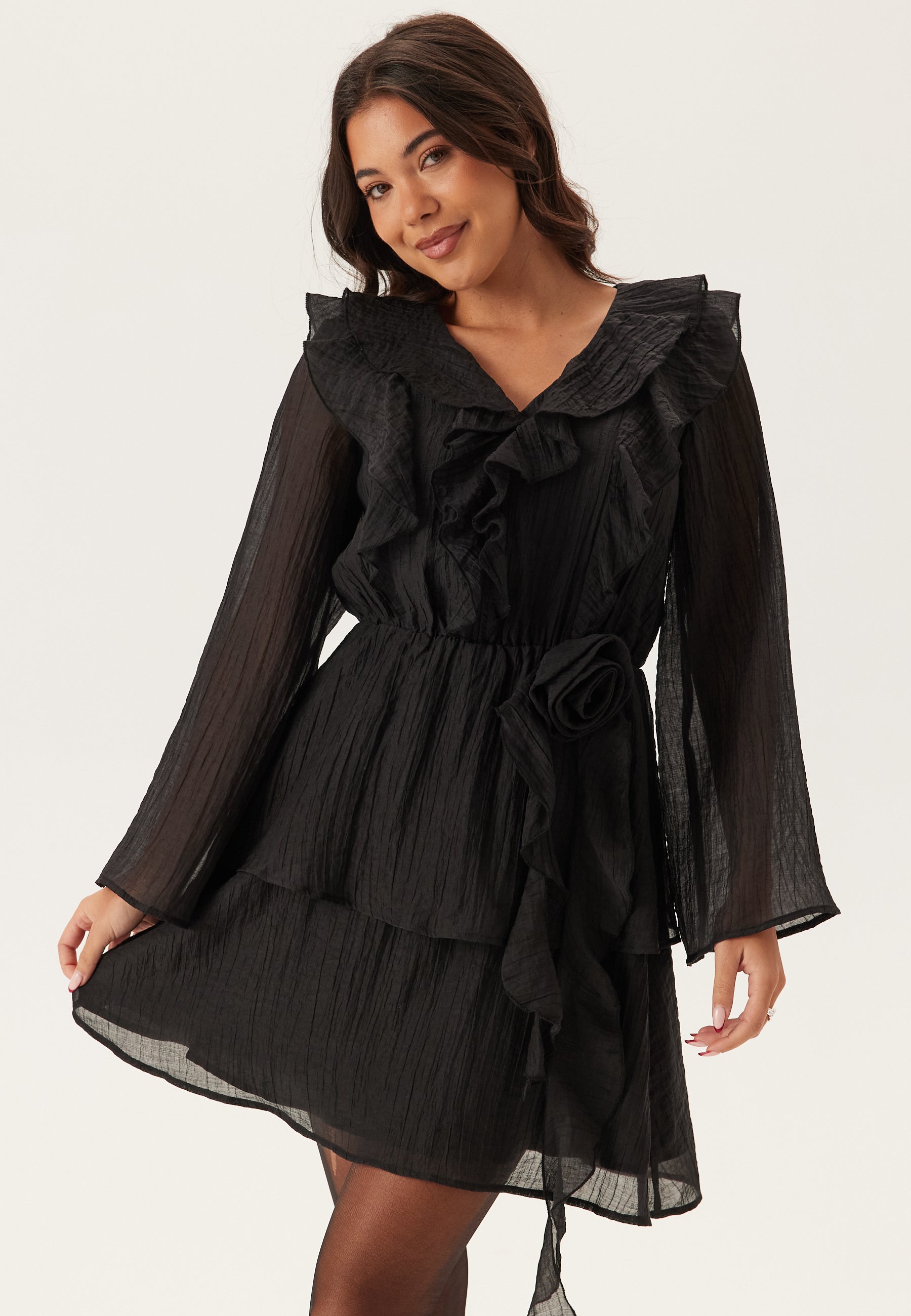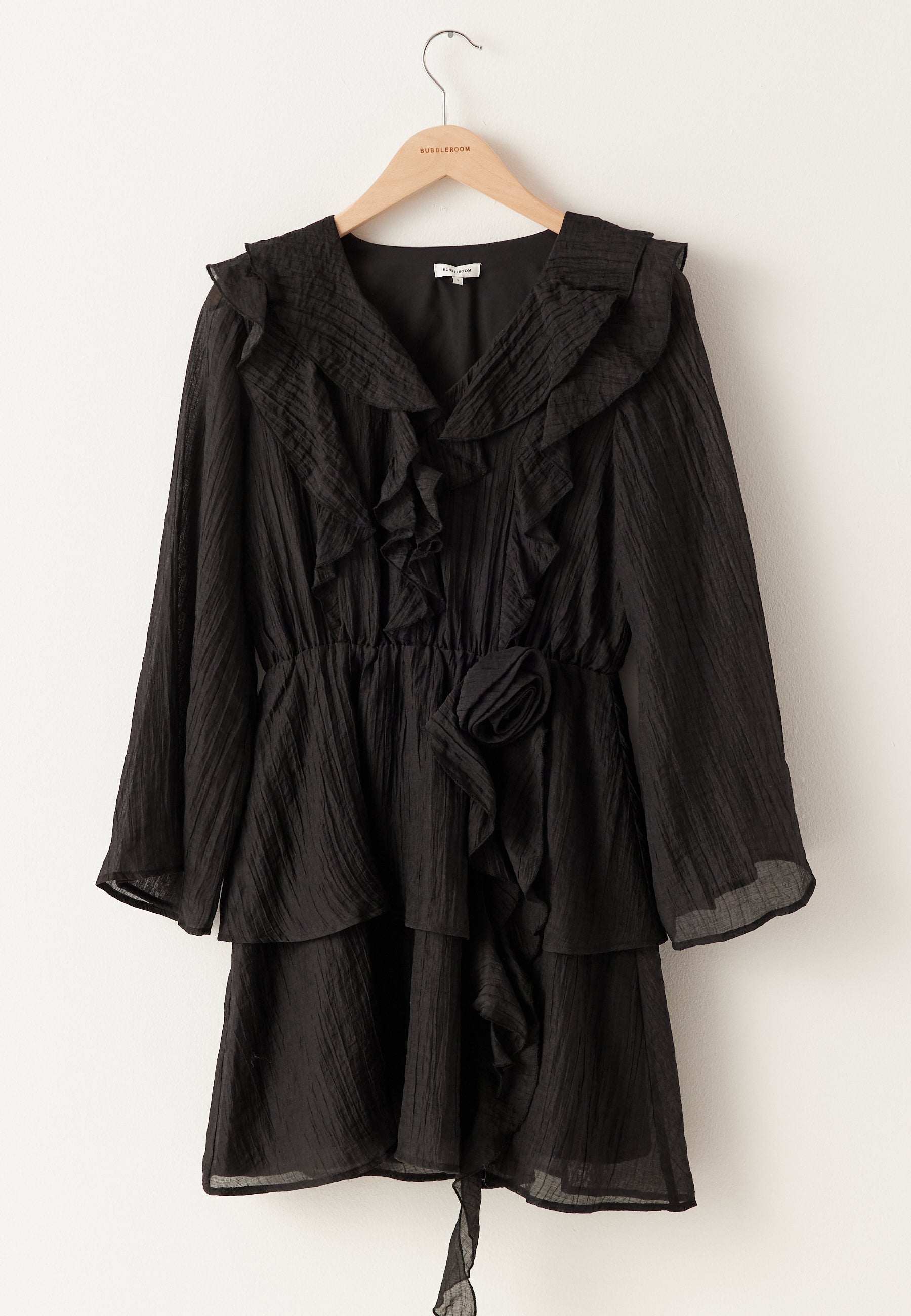 Det vevde stoffet har et lett transparent og strukturert uttrykk som gir fin bevegelse i de vide ermene og de lagdelte volangdetaljene. V-utringningen med volang myker opp fronten, og den dekorative rosen i midjen gir kjolen en ekstra fin finish som føles litt mer spesiell enn den vanlige svarte festkjolen. Den er fôret for bedre dekning, så du får det luftige uttrykket med litt ekstra trygghet.