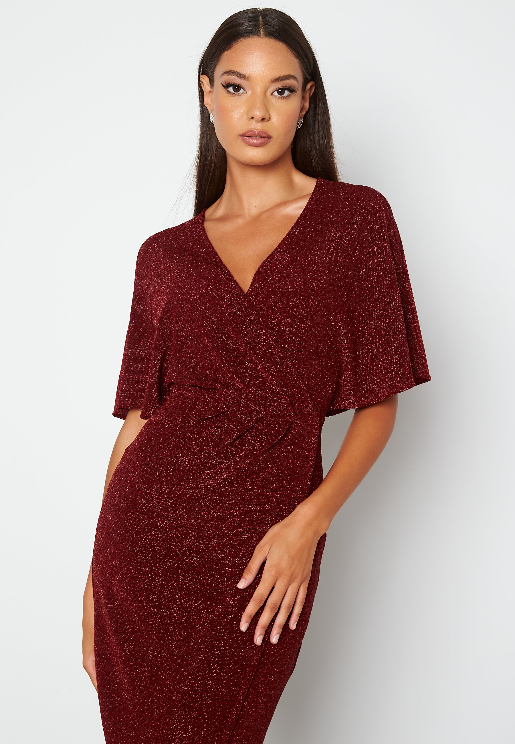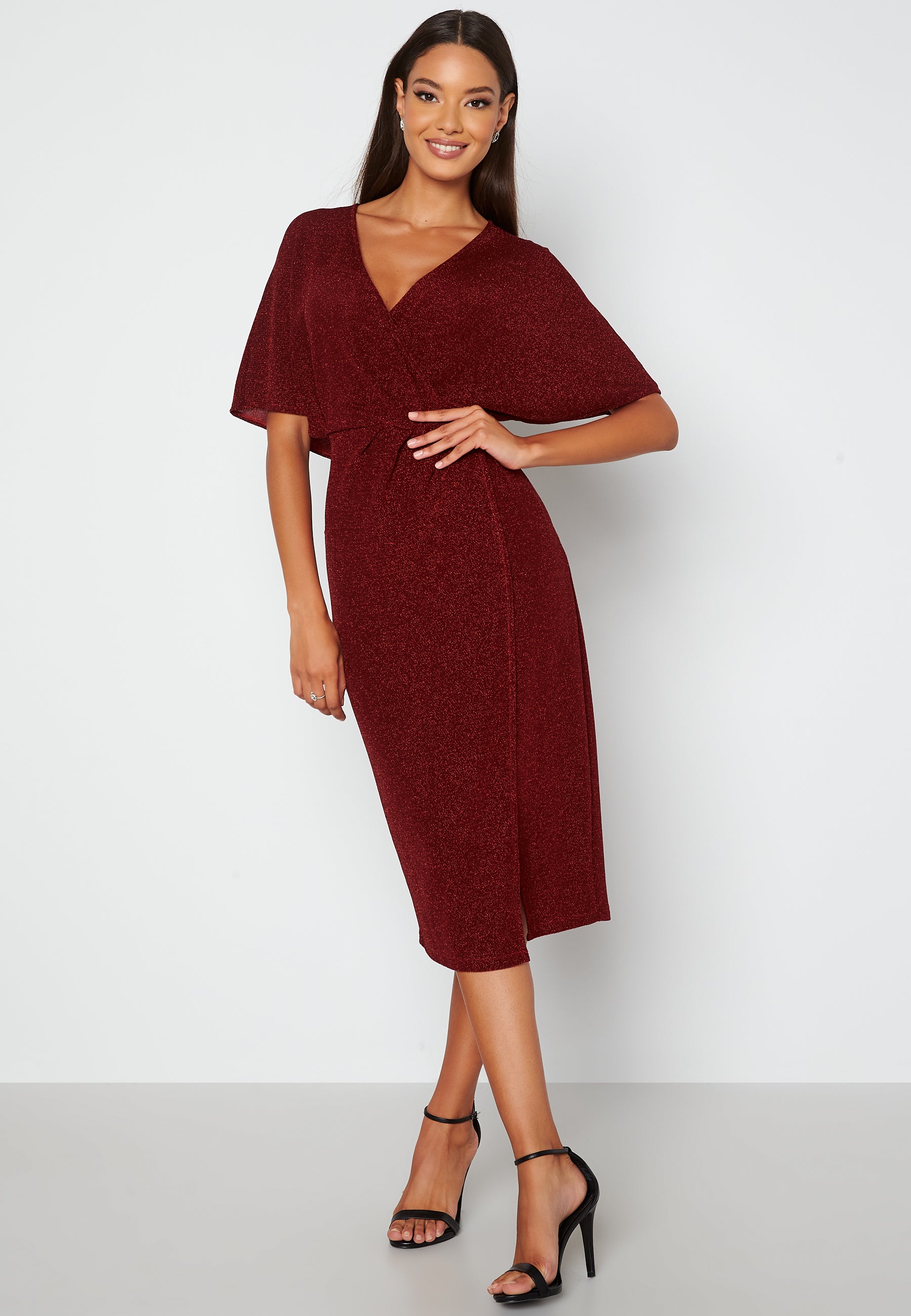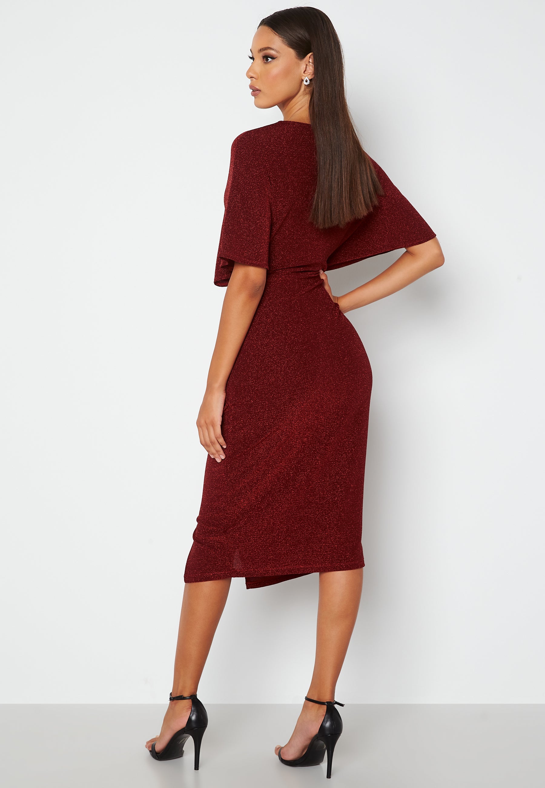 Feminin, glitrende midikjole fra BUBBLEROOM med en liten splitt. Den har et bredt erme.