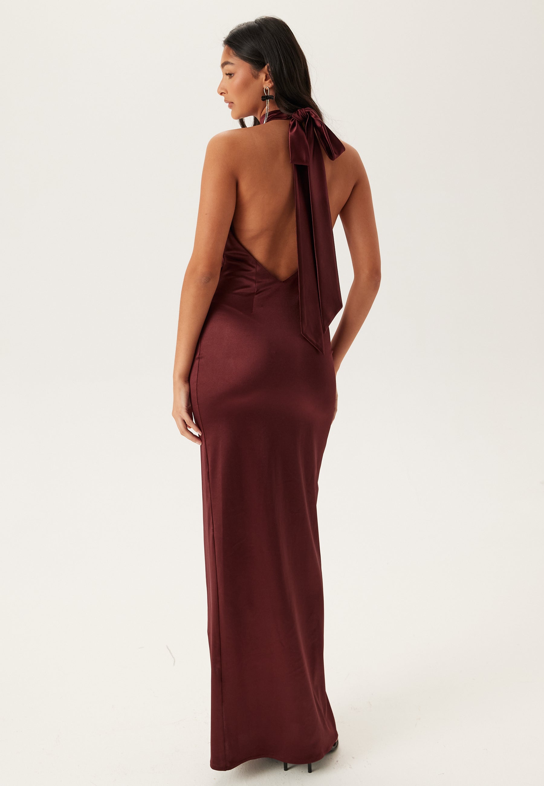 Denne maxikjolen med halterneck i stretchy jersey med satenglook er laget for bryllup, skoleball og andre formelle anledninger når du vil ha en smal, kroppsnær passform som fortsatt er behagelig å bevege seg i. Den høye halterneck-utringningen gir kjolen en ren og moderne fasong, mens den dype vinrøde tonen og den myke glansen gjør at den føles litt mer spesiell enn en klassisk selskapskjole.