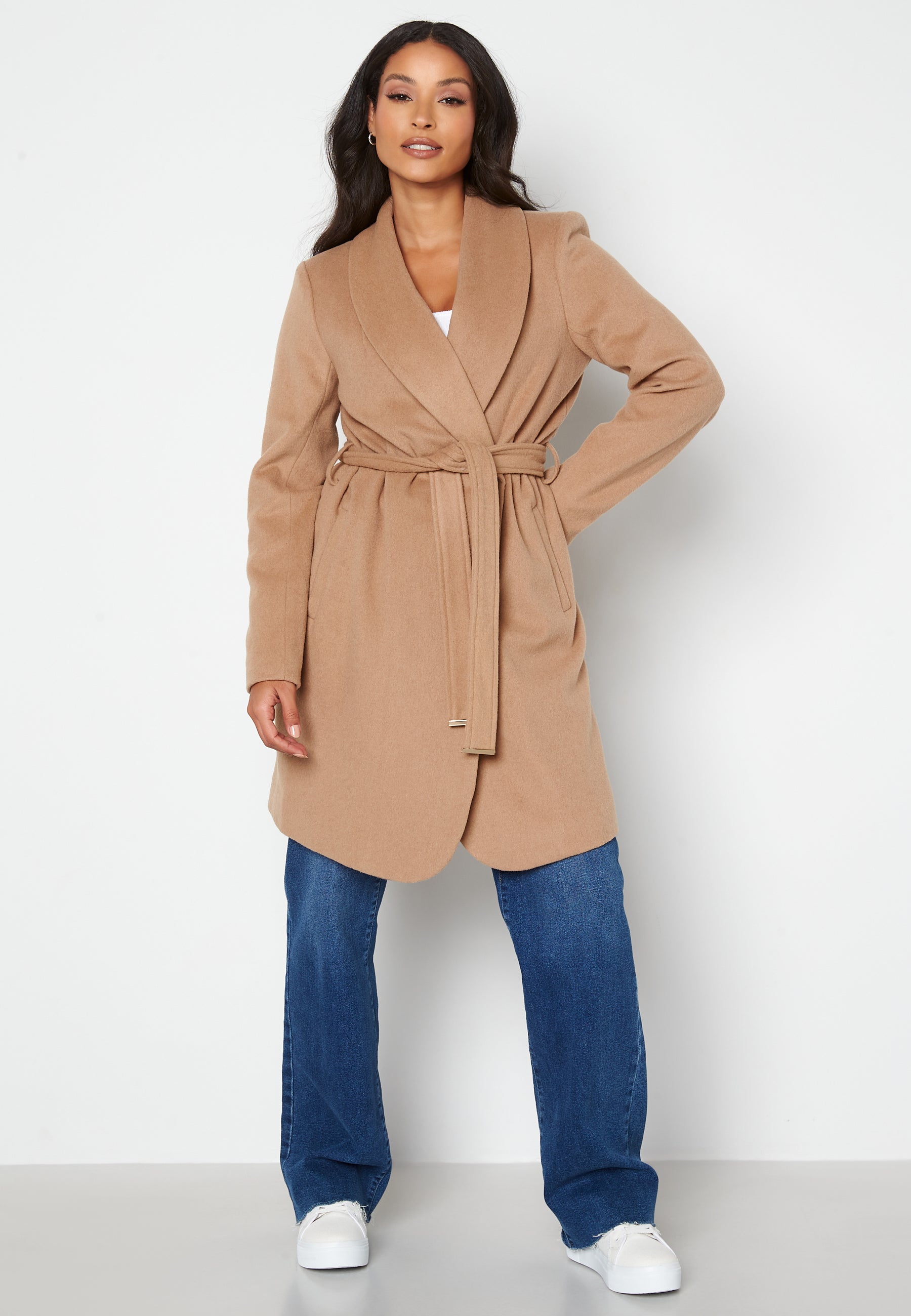 • Fin høstkåpe i ullblanding, fra CHIARA FORTHI. Kåpen har to lommer foran samt et belte i midjen. Den har en avtagbar fuskepelskrage på jakkeslaget.