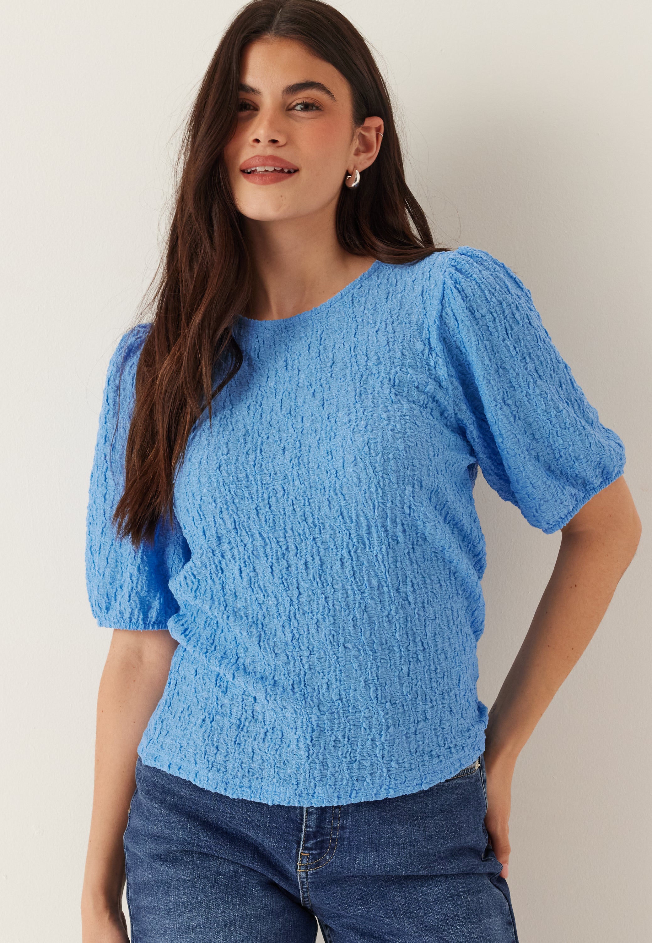 Denne blå toppen med struktur er en enkel og fin hverdagsfavoritt, med stretchy komfort, rund hals og myke bobleermer som gjør jeans-og-en-fin-topp-antrekket litt mer gjennomført. Det er en sånn topp du bare kan slenge på deg til lunsj, på jobb eller i helgen når du vil være komfortabel uten å se for enkel ut.