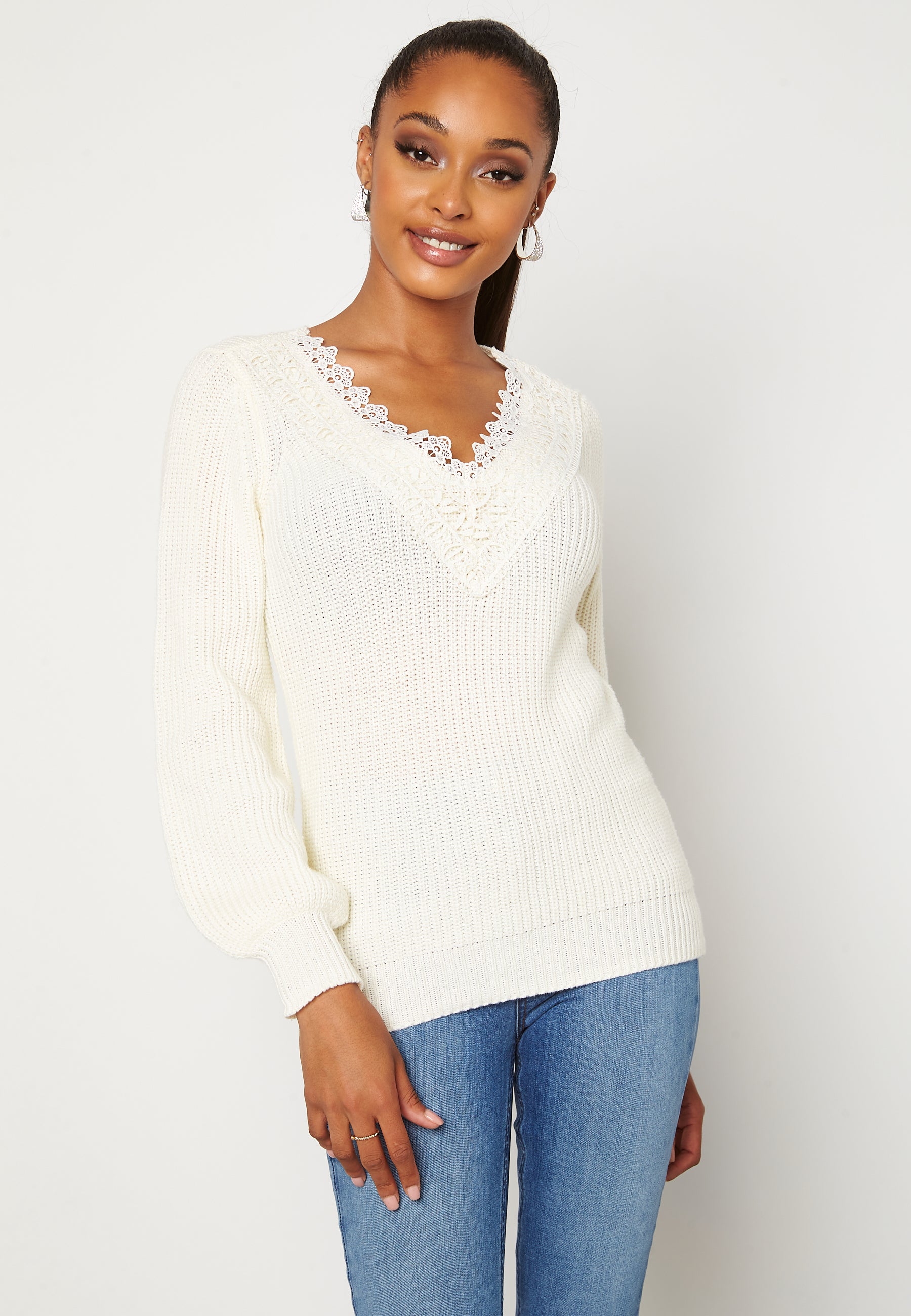 Strikket genser med blonde, fra HAPPY HOLLY. Genseren er myk og har en elastisk kvalitet