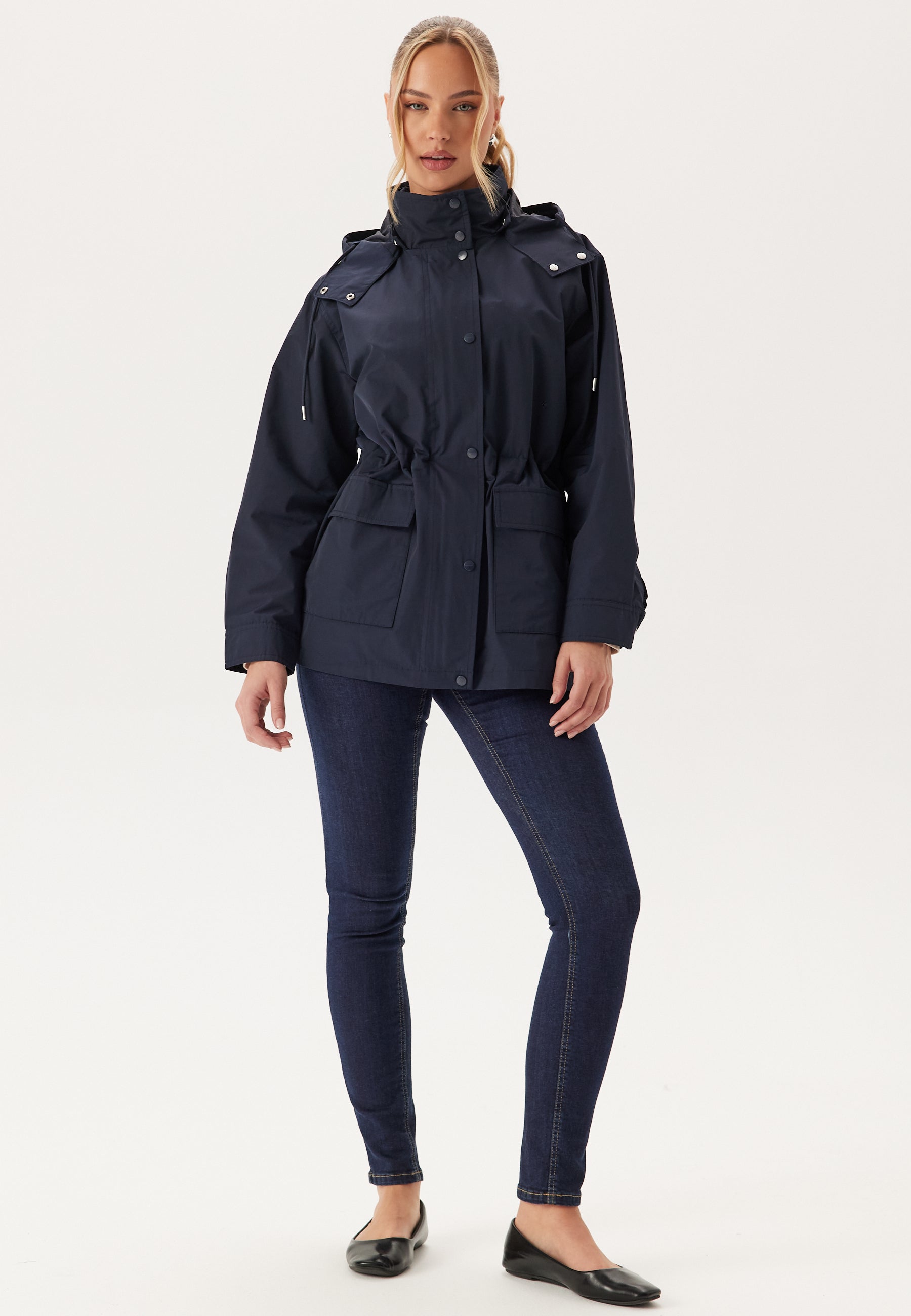 - Snøring ved midjen og på hetten.