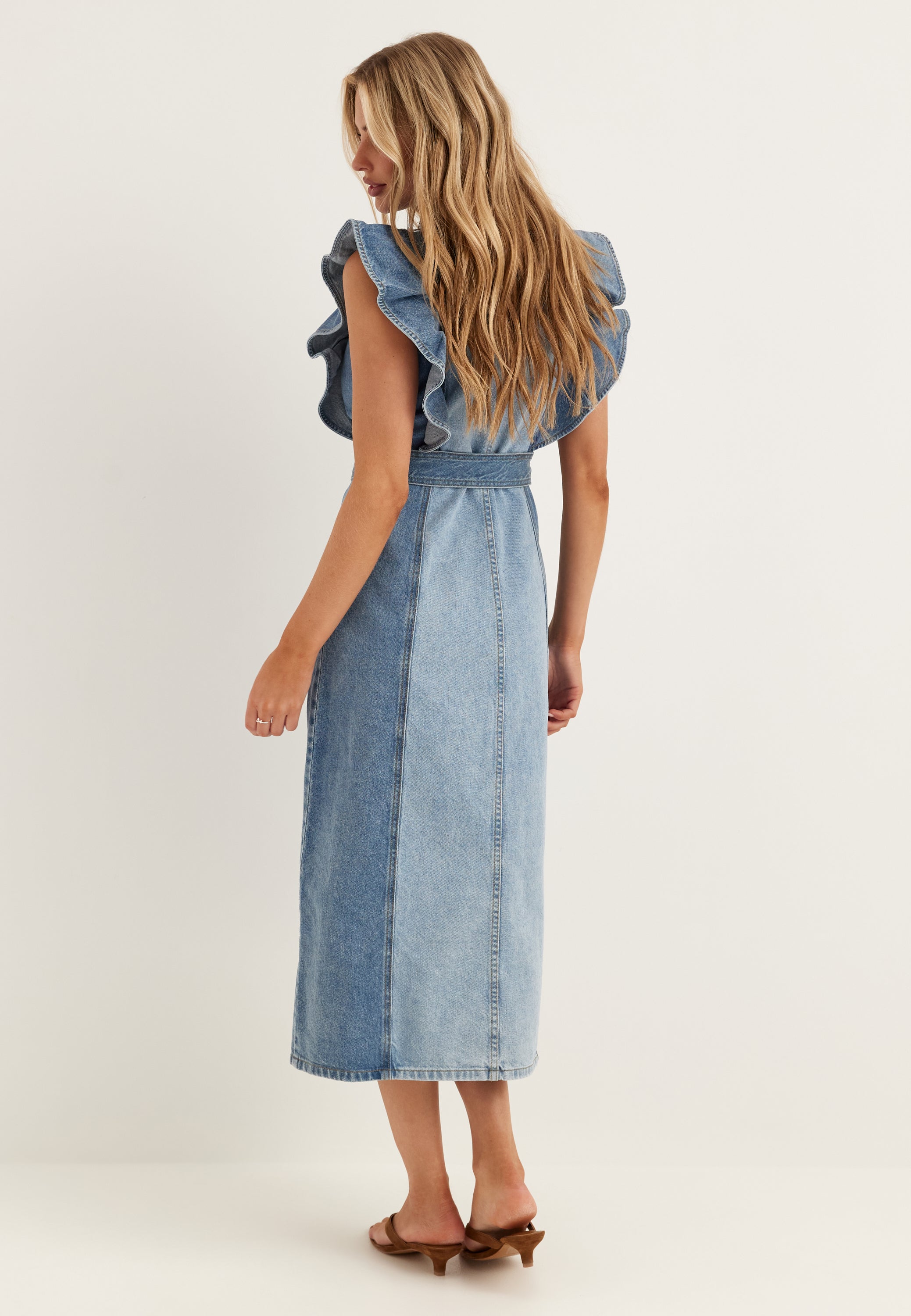 Denne ermeløse denimkjolen i medium blå er en enkel favoritt til sommerplaner, helger og avslappede middager når du vil ha ett plagg som ser gjennomført ut. Skjortekjolefasongen med knapper foran gir et rent og klassisk uttrykk, mens volangdetaljene på skuldrene gjør den mykere og litt mer spesiell enn en vanlig denimkjole.