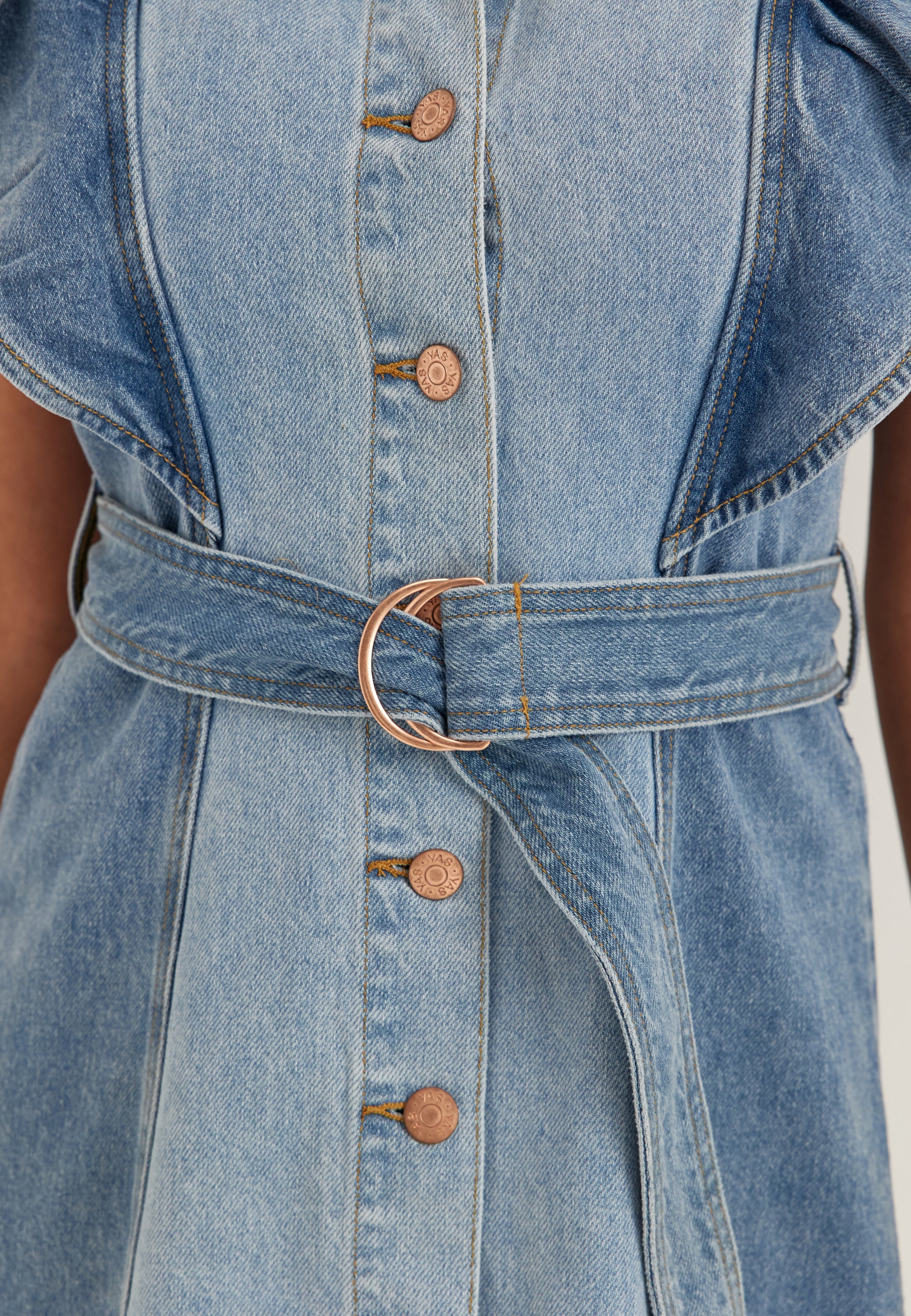 Laget i denim uten stretch, har den en fast følelse som holder fasongen fint gjennom dagen. Skjortekragen, linningen og lengden på 125 cm målt fra fremre skulder i størrelse 36 gir en flatterende og definert silhuett, og det matchende beltet med ringdetalj gir ekstra form i midjen.